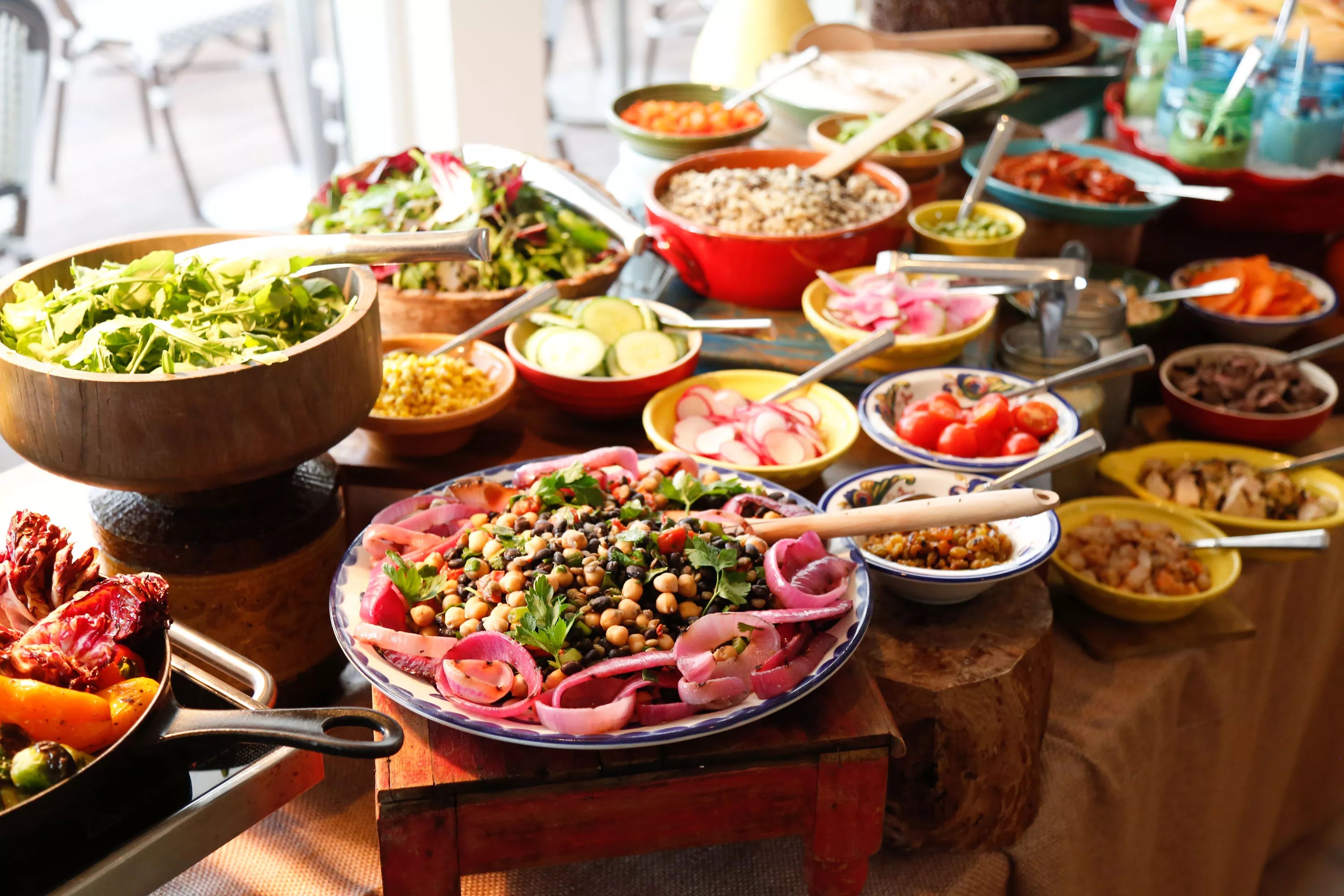 Other items include roasted root vegetable salad with arugula, pistachio, and golden raisins; three bean salad with queso fresco and cilantro; and a build-your-own quinoa salad station with tomatoes, corn, dried peaches, chicken, steak, and shrimp.