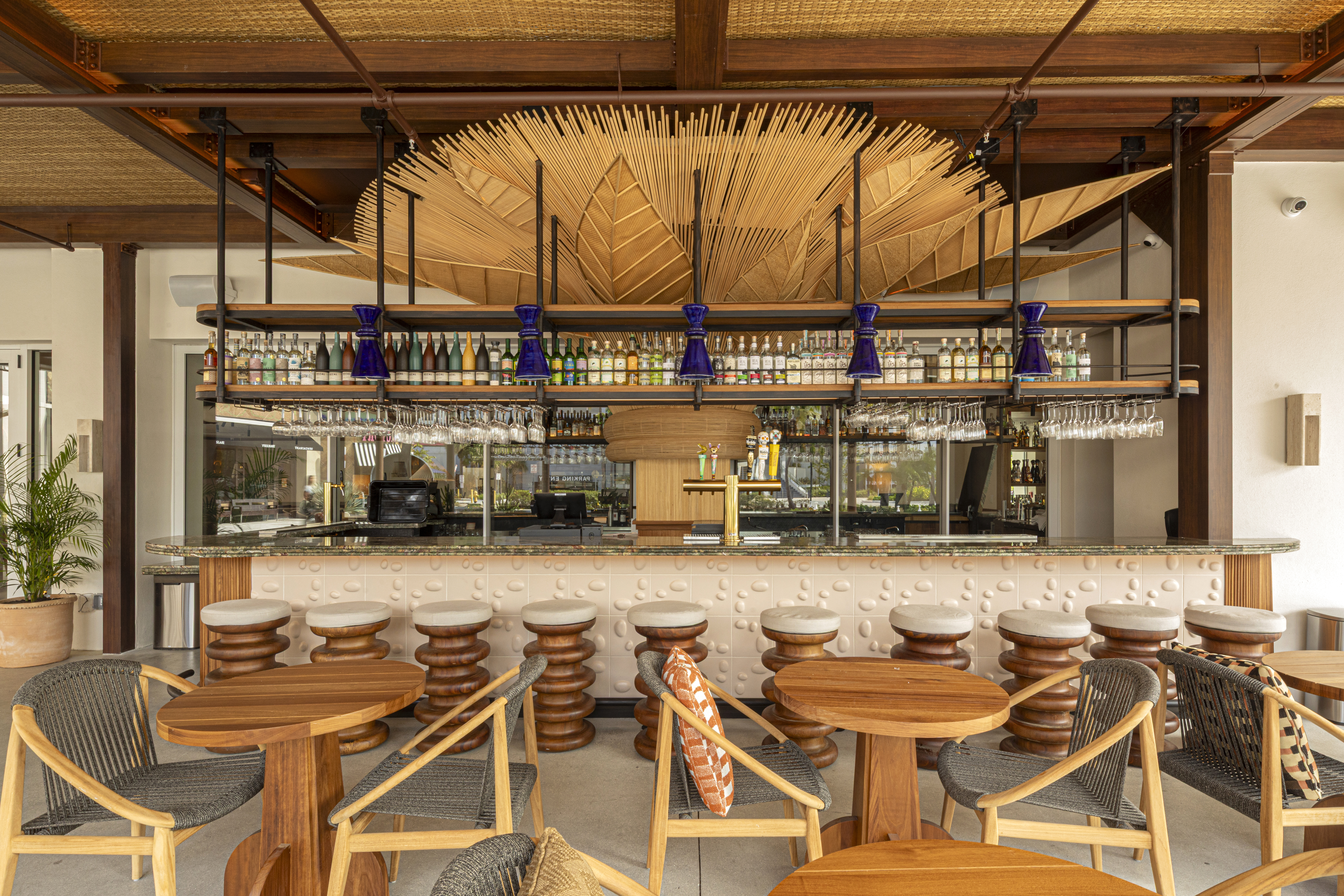 Jacinta de México avoids the polished, hyper-sleek mall aesthetic of the restaurant. Green marble, white trencadis, woven textures, ceramics, and hanging greenery shape the room. A large tree sculpture marks the bar and ties the space together, a nod to the women and home kitchens that inspired the concept, where cooking was rooted in routine rather than performance.
