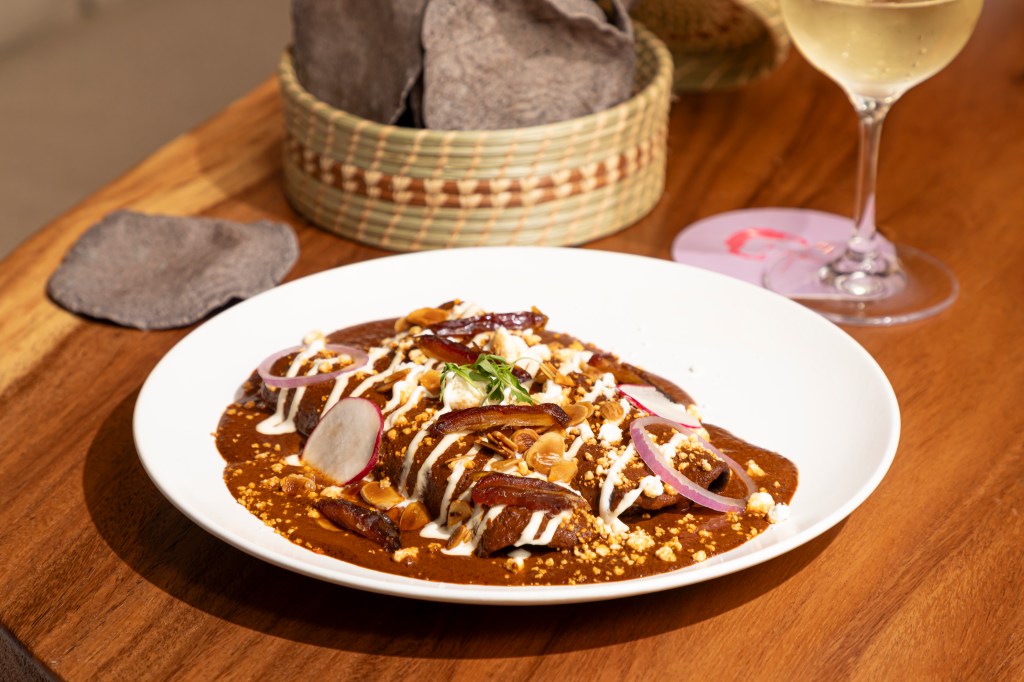 From the wood grill, the kitchen turns out octopus, skirt steak, Atlantic salmon, whole branzino, and a tomahawk meant for sharing. Baked Chilean seabass Veracruz-style, roasted in tomatoes, olives, capers, jalapeños, herbs, and served with basmati rice. A seafood and rice casserole brings together shrimp, octopus, calamari, seabass, brandy, saffron, and lemon. Enmoladas (tortillas in mole) pair almond mole, Medjool date coulis, and goat cheese with pulled chicken or duck confit.
