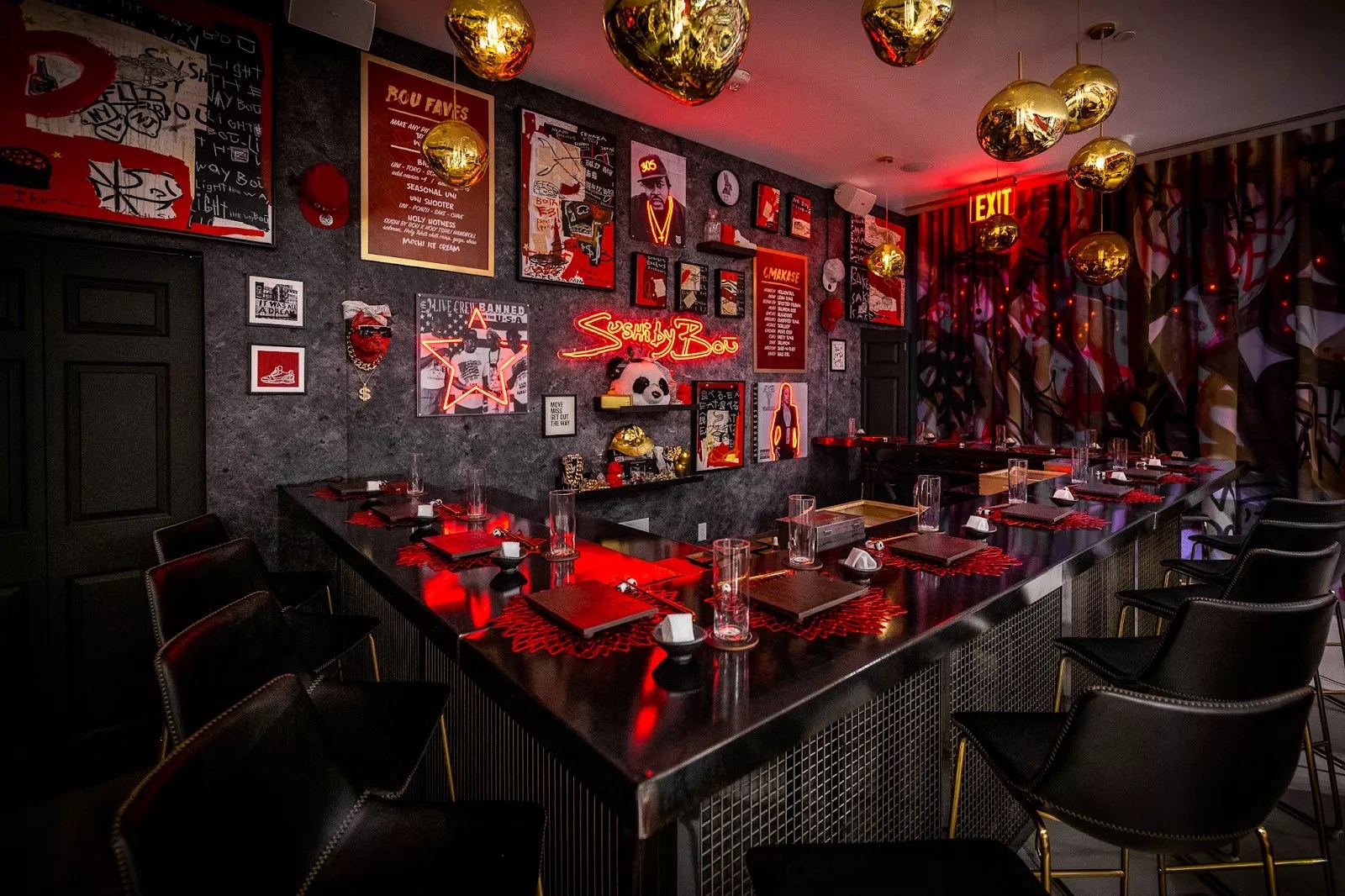 In Wynwood, guests will stop by on the third floor of the hotel and make their way to the newly renovated speakeasy. Dimly lit and with dark decor, the walls are now decorated with abstract graffiti and portraits of musical “OGs” like the Notorious B.I.G. as an ode to ’90s hip-hop. The dim lighting, velvet, black screen dividers, and crimson curtains enhance the atmosphere’s exclusive aura. The space is equipped with a 14-seat omakase counter, an eight-seat bar, and a 14-seat lounge area to enjoy craft cocktails.