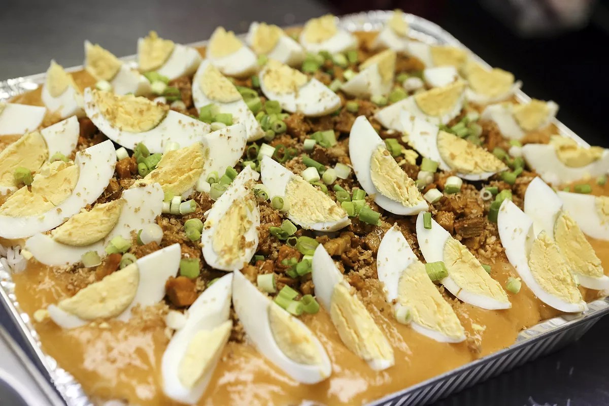 The most memorable dishes were dinuguan and sisig, also known as pork blood stew and stir-fried pig face. For the stew, pieces of pork are marinated in vinegar, salt, garlic, and bay leaves. Next the blood is very gently heated and, as it warms, the pork and its seasonings must be quickly stirred in. The process creates a rich, not too iron-tasting emulsion that rivals hefty soups like Greece’s avgolemono and New England’s clam chowder. Pancit palabok Photo by CandaceWest.com