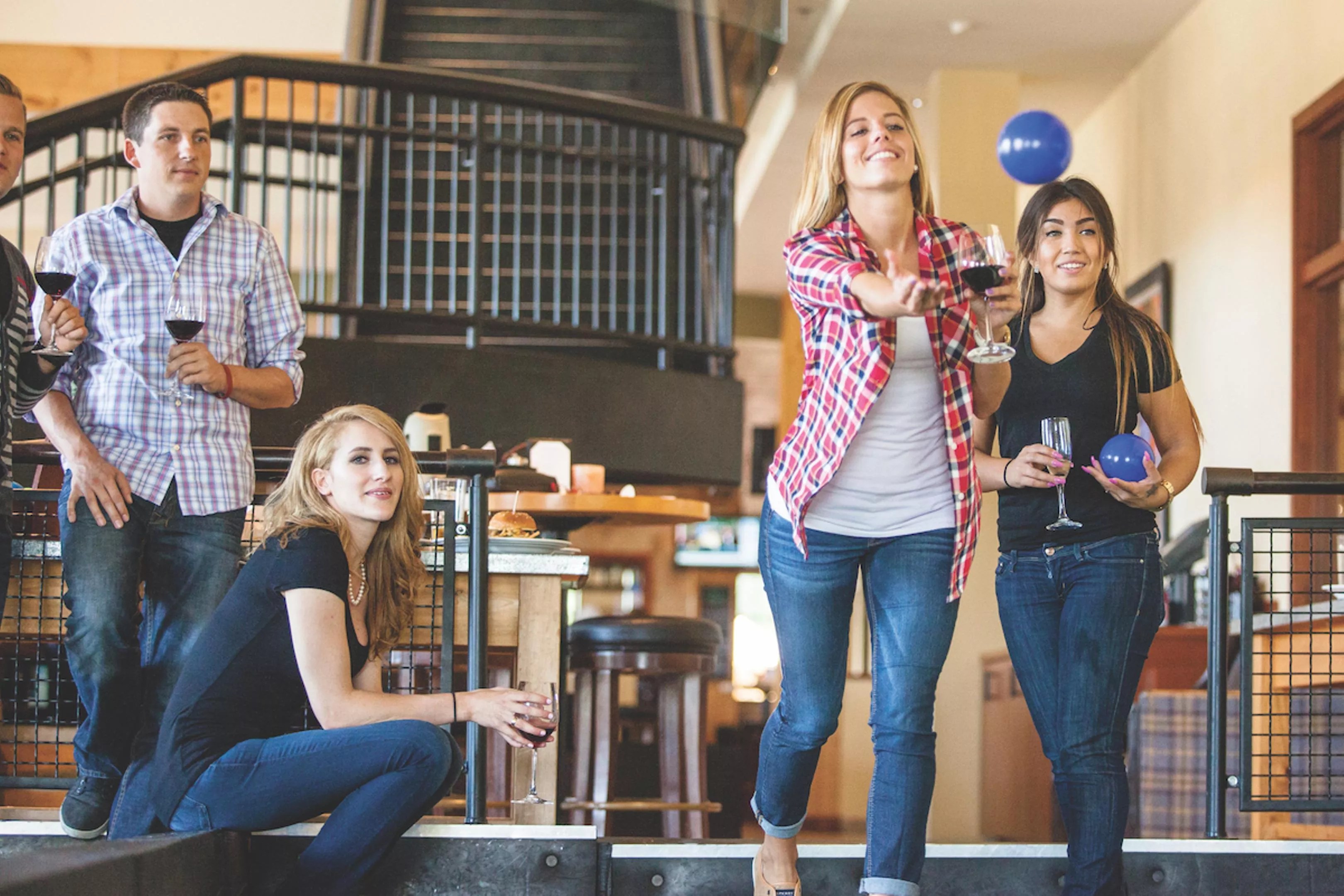 “Lively” is the word that comes to mind when stepping through Pinstripes’ front door. If the swirl of sporty activities doesn’t do it, both levels feature expansive bar areas draped in floor-to-ceiling windows and big-screen TVs for big-game action. According to Keller, plenty of events are in the works to keep guests coming back, too.