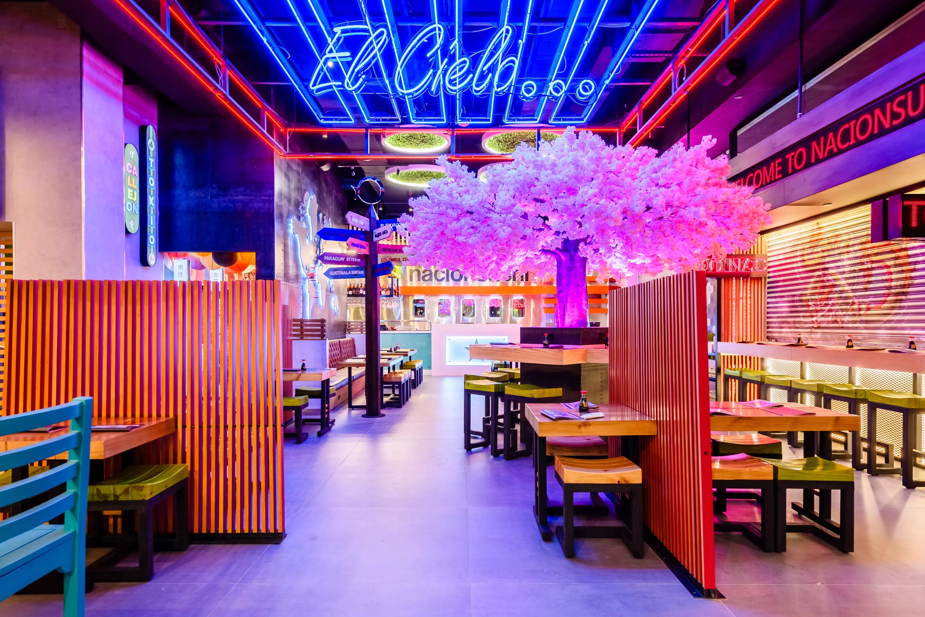 From a neon pop-art ceiling to a cherry blossom tree anchoring the central plaza, Nacionsushi’s design is fun and bold.