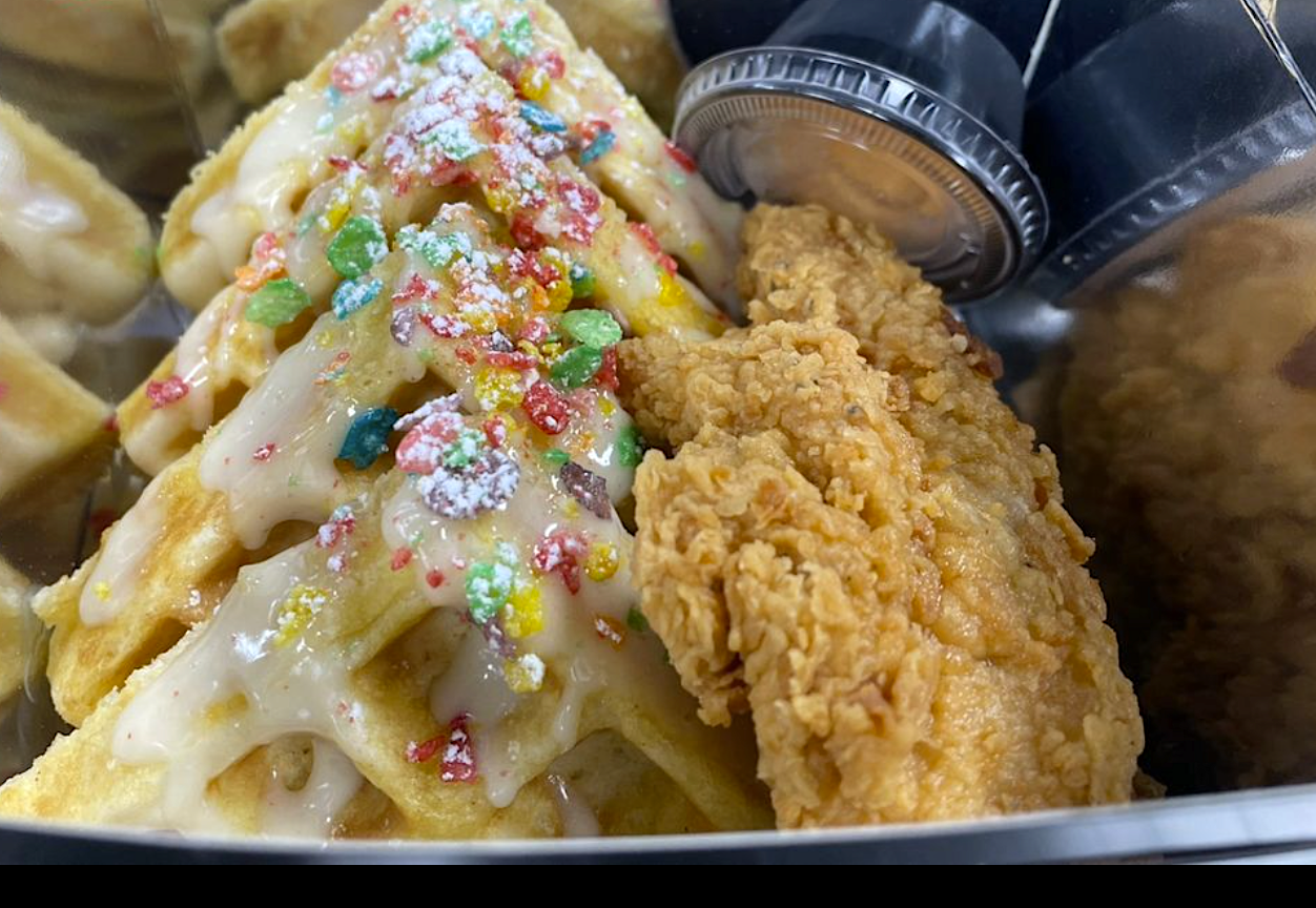 The “Fruity Pebbles” chicken and waffles from Crisppi’s Chicken by Randy Moss