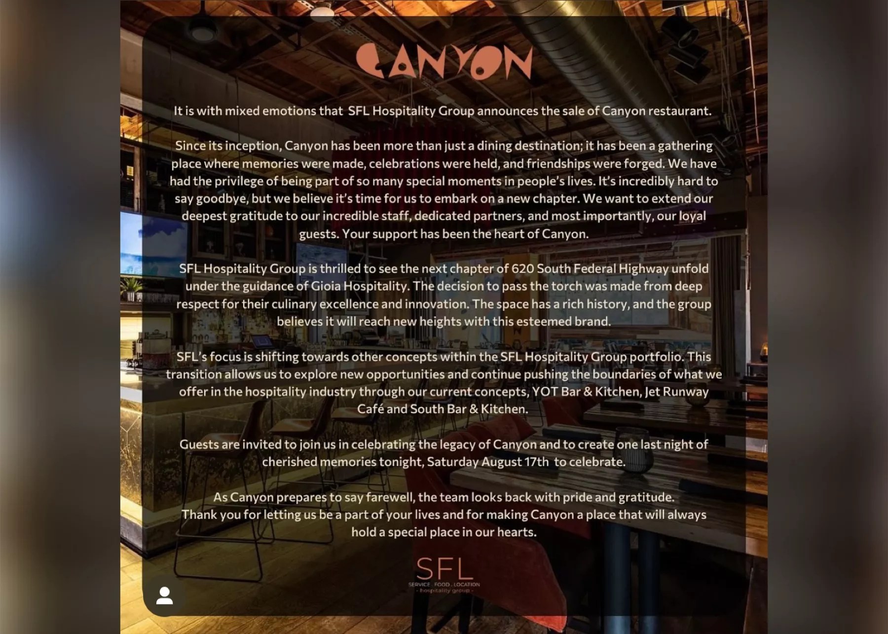 “It is with mixed emotions that SFL Hospitality Group announces the sale of Canyon restaurant,” the statement begins. “Since its inception, Canyon has been more than just a dining destination; it has been a gathering place where memories were made, celebrations were held, and friendships were forged. We have had the privilege of being part of so many special moments in people’s lives. It’s incredibly hard to say goodbye, but we believe it’s time for us to embark on a new chapter. We want to extend our deepest gratitude to our incredible staff, dedicated partners, and, most importantly, our loyal guests. Your support has been the heart of Canyon.”