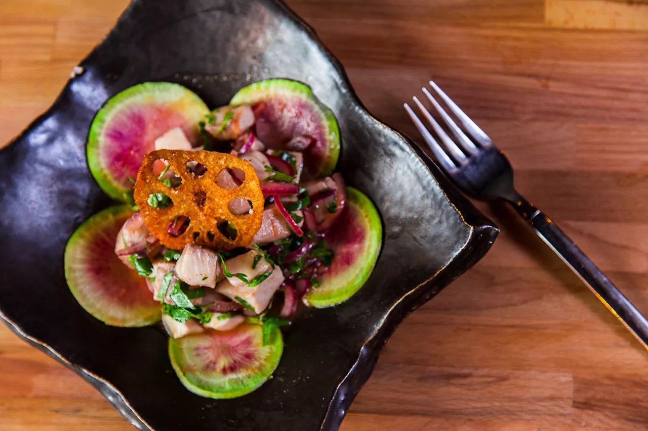 The result is a list of global offerings, including staples from the Oropezas’ native country. Cachapas, the beloved Venezuelan corn cakes, take on an added dimension at Sins when served with chicharrón and a sour cream and cilantro sauce.