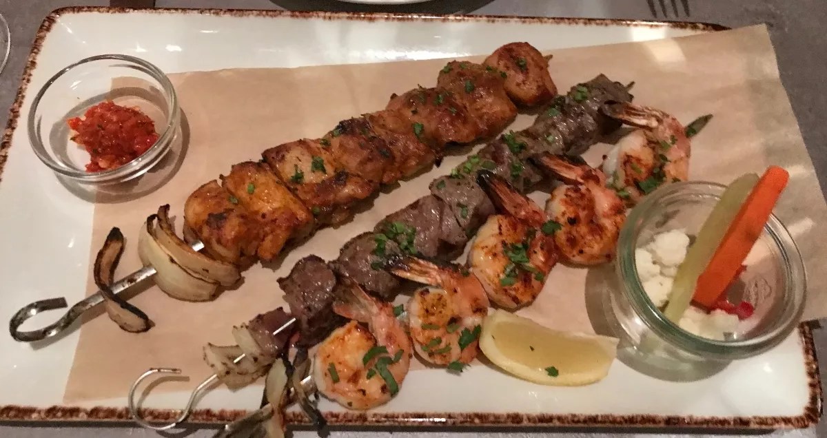 At Cleo, dine family-style on kebabs, flaming saganaki, and meatball shakshouka, topped with a soft egg, tomato, squash, and piquillo peppers ($28).
