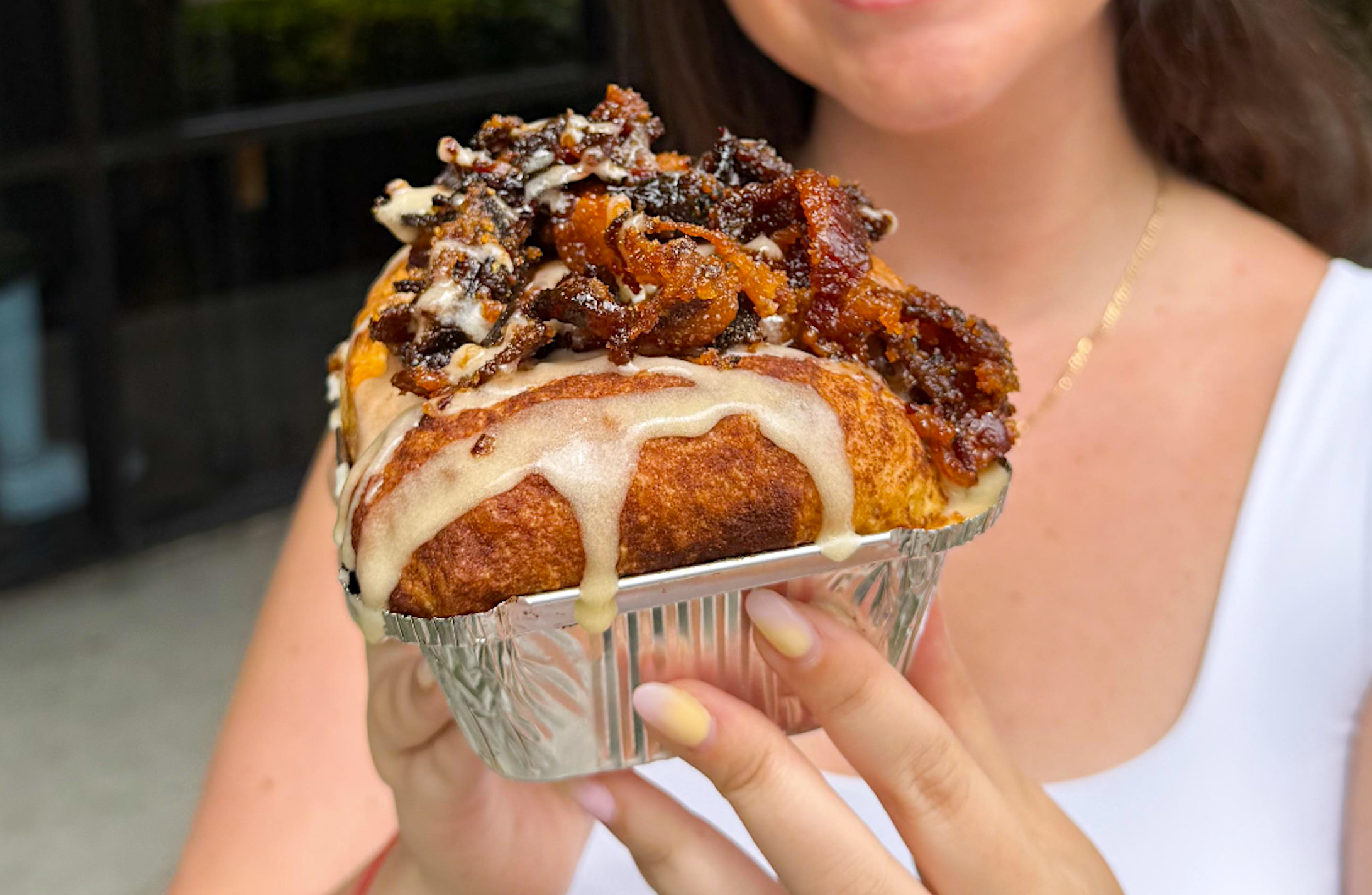 From there, things get more fiendish. The “6 Degrees of Maple Bacon” cinnamon bread strikes a balance between sweetness and smoky crunch. The “Swine in a Sweater,” a smoked sausage wrapped in flaky pastry and drizzled with maple glaze icing, pushes sweet and savory into new territory. Add in empanadas (beef, chicken, ham and cheese, spinach, or pizza) and pastelitos (guava, guava and cheese, cheese, or meat), and you’ve got a menu that reads like a greatest hits album of South Florida comfort food.
