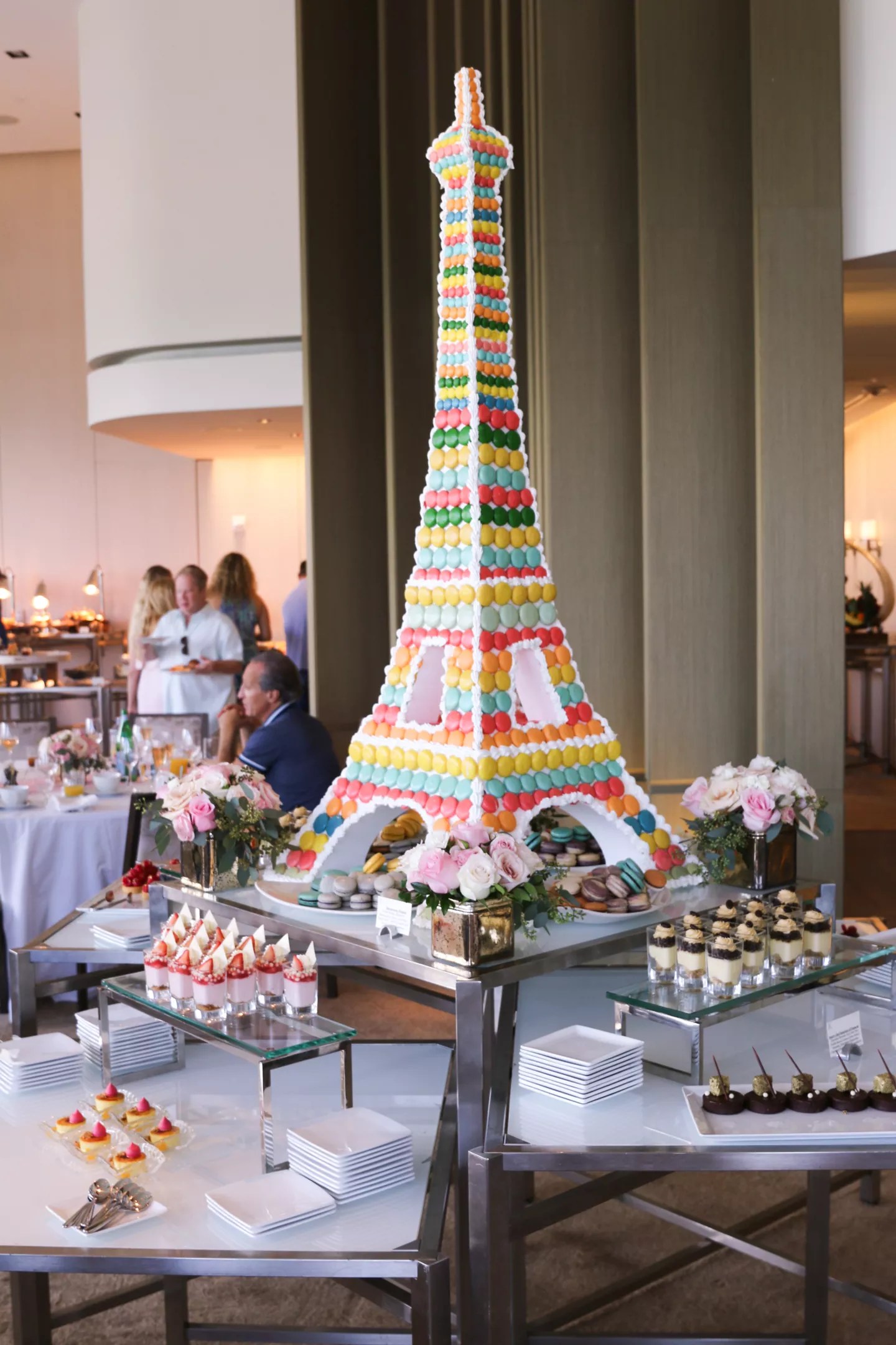 A large dessert table is anchored by a five-foot-tall macaron display in the shape of the Eiffel Tower. Sparkly cake pops, key lime pie, chocolate mousse, and other sweets orbit the centerpiece of colorful meringue cookies.