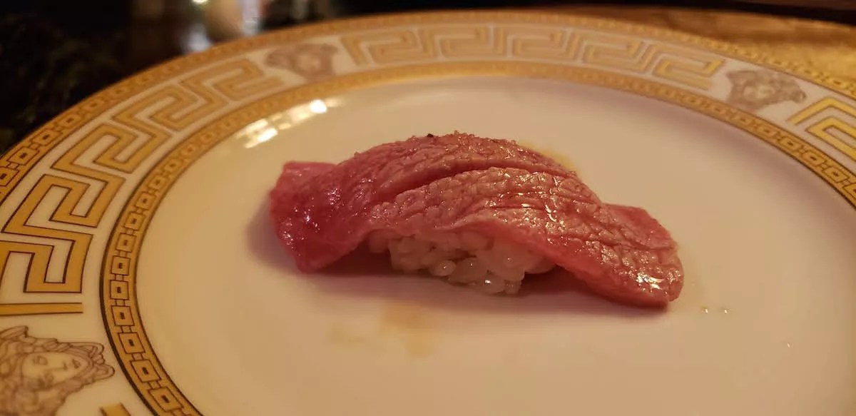 Other standouts included a piece of skipjack tuna crowned with shredded ginger and chive, a generous heap of Santa Barbara sea urchin, chu-toro, medium fatty tuna with pickled fresh wasabi, and a slab of the fatty tuna called o-toro culled from the beast’s collar that gave the bite a deep, almost raw meat flavor uncommon in this traditional fat bomb. Finally came an o-toro and pickled daikon hand roll and a vaunted piece of the egg sushi called tamagoyaki that was akin to a creamy custard somehow set in solid form. Kama (collar) o-toro. Photo by Zachary Fagenson