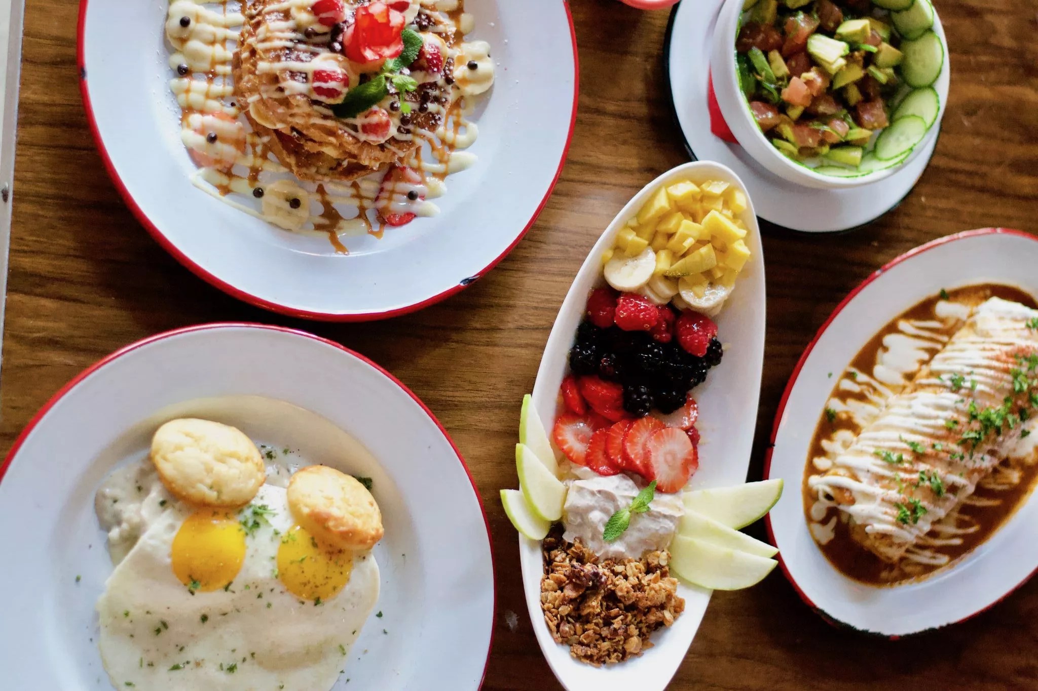 Remaining on the menu are fan favorites rsuch as the Ridiculous French Toast, which comes layered with bananas and strawberries, vanilla cream, and a mixed berry compote with fresh mint ($14), as well as the Banging Brunch Burrito, stuffed with scrambled eggs, queso fresco, braised pork, fire-roasted green chilies, refried beans, and salsa roja ($12).