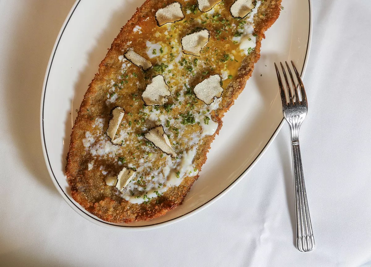 The Spanish Tatel is also known for its veal Milanese. A waiter wheels a large portion of thinly sliced, breaded, golden veal to the table and cracks a 63-degree egg over it. The meat is garnished with chopped chives and summer truffles, because black truffles aren’t in season. Tatel certainly didn’t invent veal Milanese, but the kitchen executes it so well that it’s no surprise the dish has become a signature.