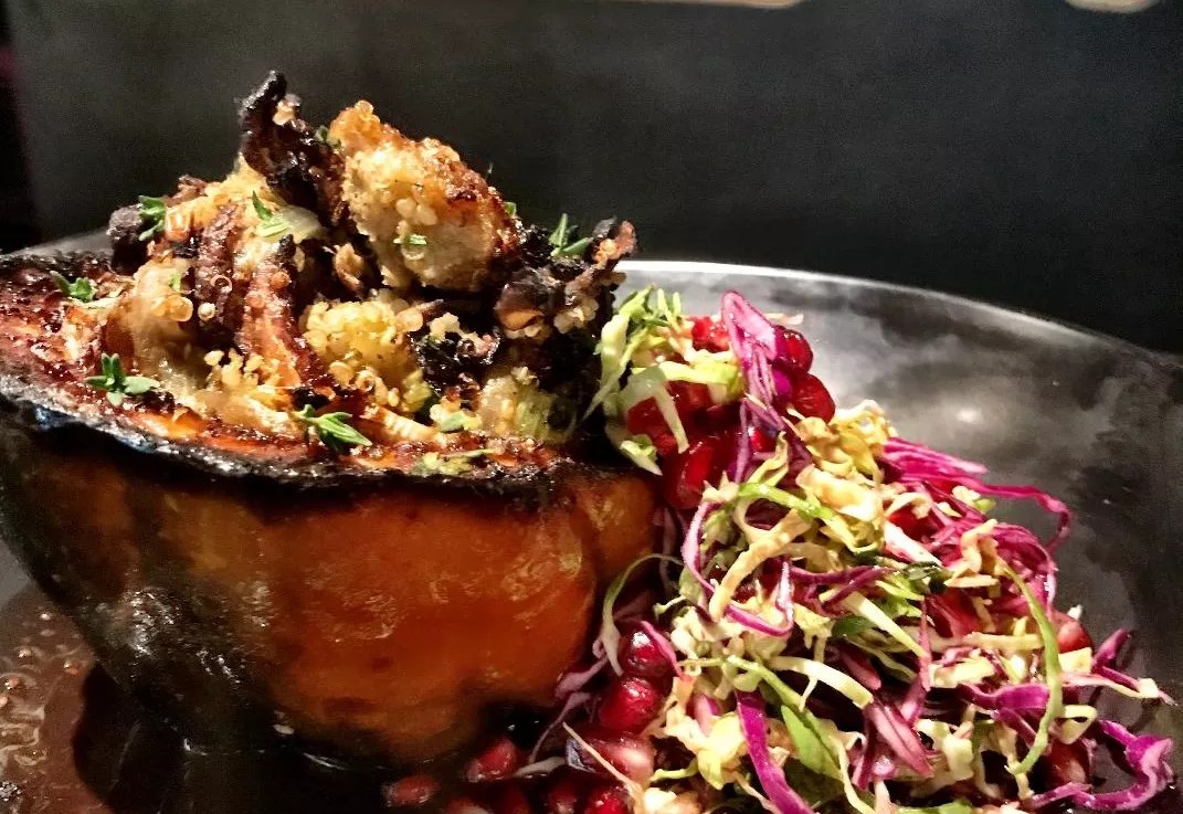 Glam Vegan. The chic midtown spot is serving a dish of stuffed acorn squash, dressing made with sage and caramelized vegetables, Brussels sprout slaw, cranberry emulsion, and pepitas for $15. An entire ube pie is also an option to take home; the ten-inch pie serves ten to 12 slices and costs $58. 3301 NE First Ave., Suite 103-1, Miami; 786-864-0590. Tuesday and Wednesday from 11 a.m. to 10 p.m. Closed Thanksgiving.