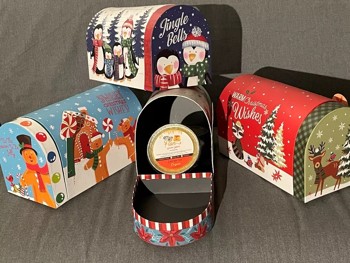 Adorable personal flans come packed in a holiday mailbox.