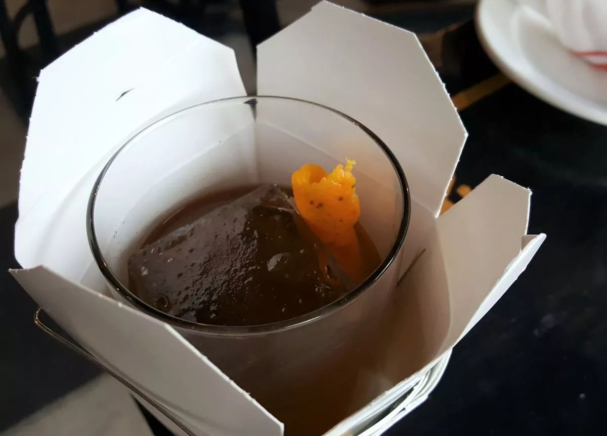 Me So Old-Fashioned: A savory version of the classic prepared using a house-made miso soup reduction, pimiento bitters, orange bitters, and Afrohead dark rum, served in a Chinese take-out box.