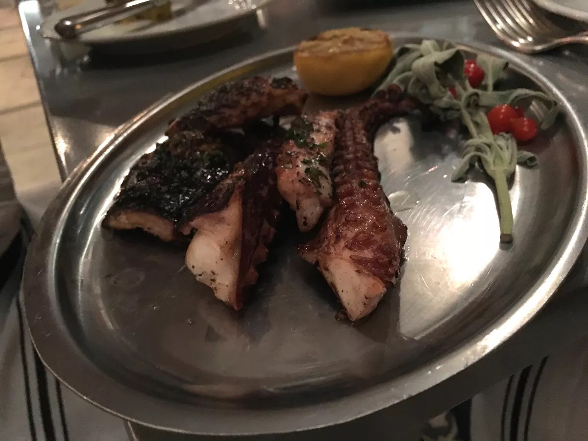 From the two fish options that appear on the menu, the daily variety, in spite of its $30 price tag, is a far better choice than an off-the-plane branzino. On a recent night, it was mutton snapper, gently seasoned and attached to its skin, which had been crisped on the grill while leaving the flesh just cooked through and moist. Octopus Photo by Zachary Fagenson
