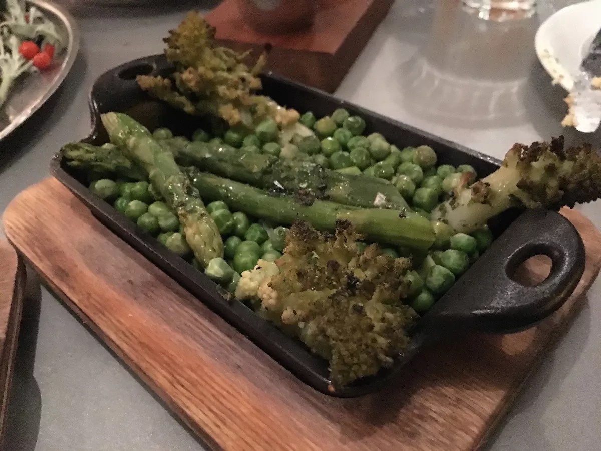 Even a skillet cornbread gets the grill treatment, and its crust is blotched by char marks that enhance the barely sweet bread ($9). The vegetable side ($9) is constantly changing depending upon what the kitchen can get ahold of, but on a recent night, a bed of blanched English peas was topped with some grassy asparagus spears and aggressively roasted romanesco broccoli florets.