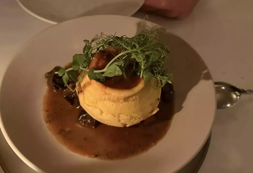 Guerrero’s escargot features snails submerged in a mushroom sauce with cremini mushrooms and bacon. On top floats a savory gruyere soufflé.