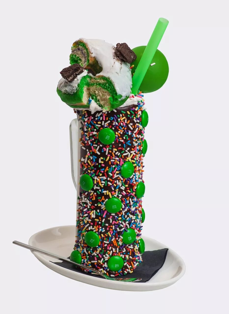 Sugar Factory’s ganache-dipped milkshake glass is studded in giant green M&M’s.