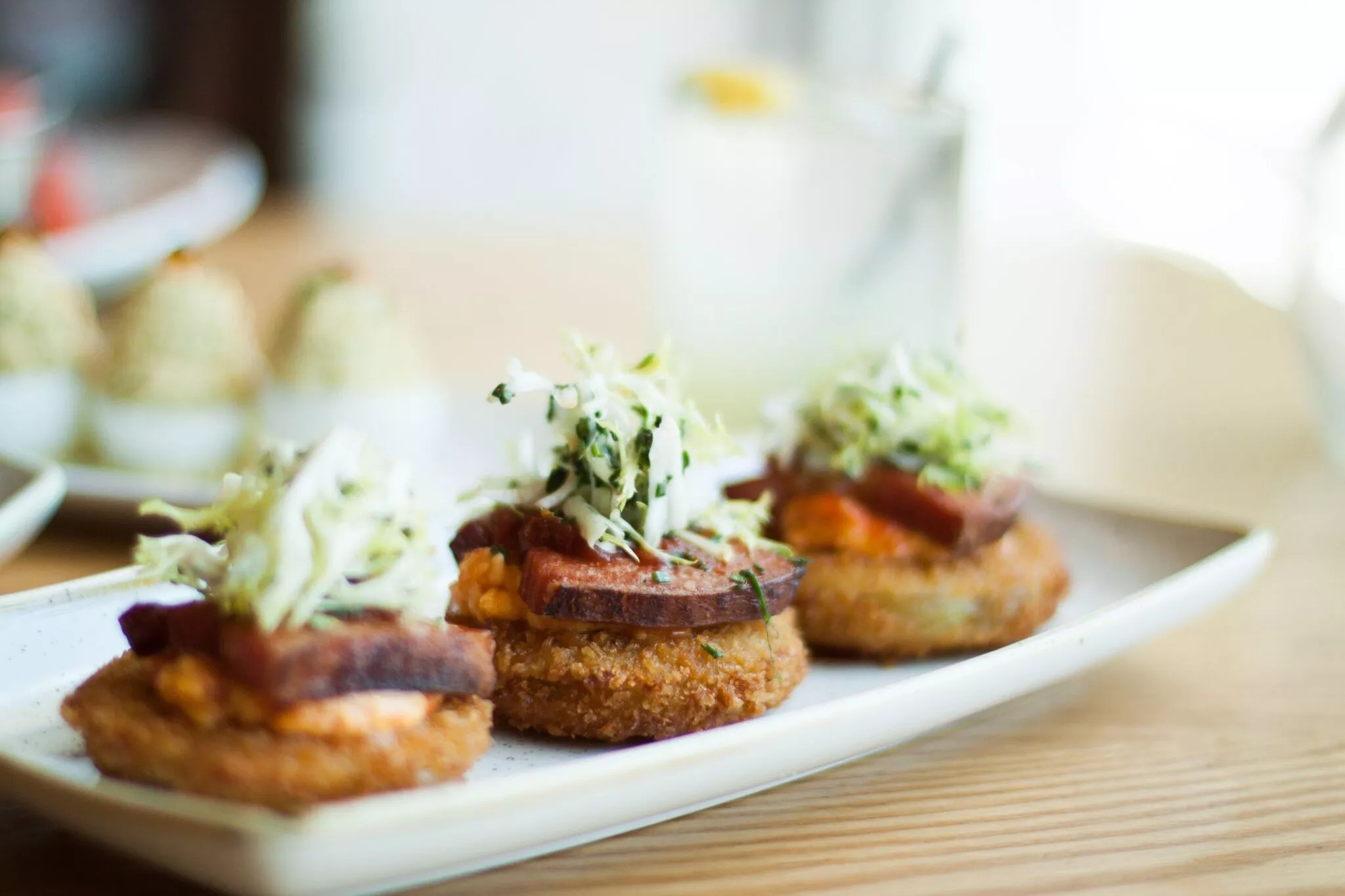 There is also a fried green tomato BLT, where a thick slice of pork belly is perched atop the tomato and served with pimento cheese, smoky tomato jam, and a lemon vinaigrette ($14).