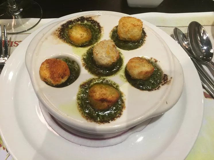 At Bistro Cassis in midtown Miami, the focus is on adhering to culinary traditions and offering authentic French fare. From the menu to the decor, New York-based Restar Hospitality Group is trying to mimic a typical French brasserie experience — right down to the massive mural of the Paris Metro. It starts with the scrumptious baguettes, which executive chef Cyrille Bolle makes fresh daily. Born in the Lorraine region of France, Bolle doesn’t take shortcuts with his cooking. Take, for instance, the escargots in a garlic-and-herb-butter sauce: The chef caps off each scintillating snail with a brioche crouton. And while some eateries cut corners and use chicken stock in lieu of a beef or veal stock to prepare French onion soup, Bolle favors veal. He also goes for Gruy