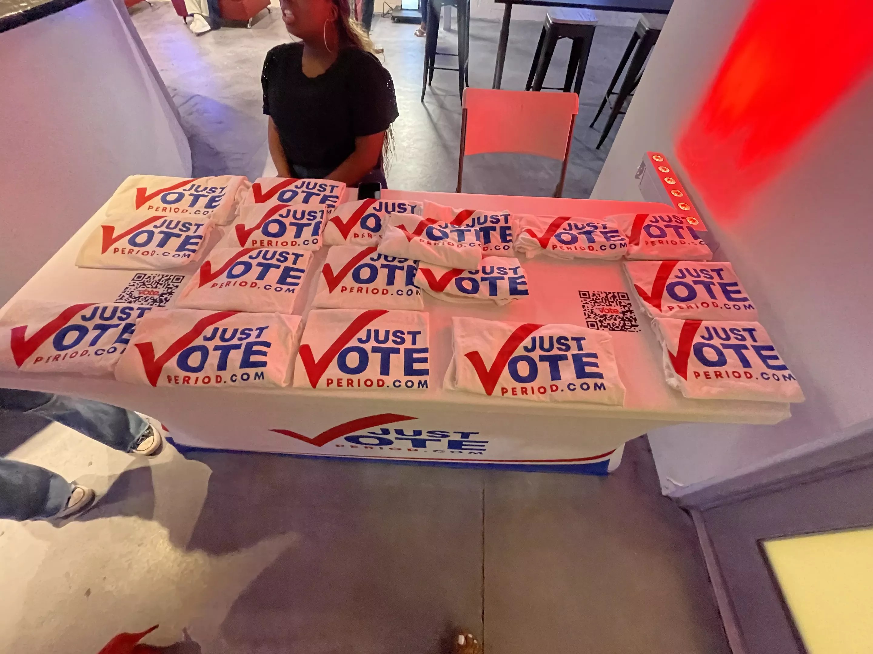 Just Vote Period T-shirts with QR codes beside them, promoting civic engagement