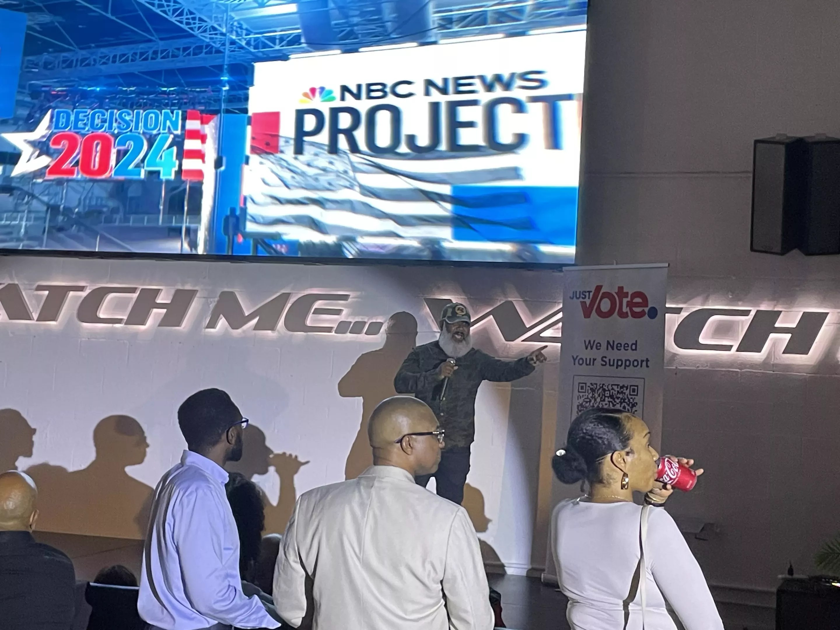Upon entering, guests were met with the quiet hum of conversations and the steady glow of MSNBC’s Rachel Maddow on a large screen, where election updates scrolled continuously across the ticker. Groups sat at high-top tables beneath the phrase “Don’t Watch Me… Watch Me,” projected on the wall above the stage – a reminder of the importance of civic participation. The crowd, primarily from the Black community, conveyed a sense of shared purpose as they leaned in to discuss the unfolding events.