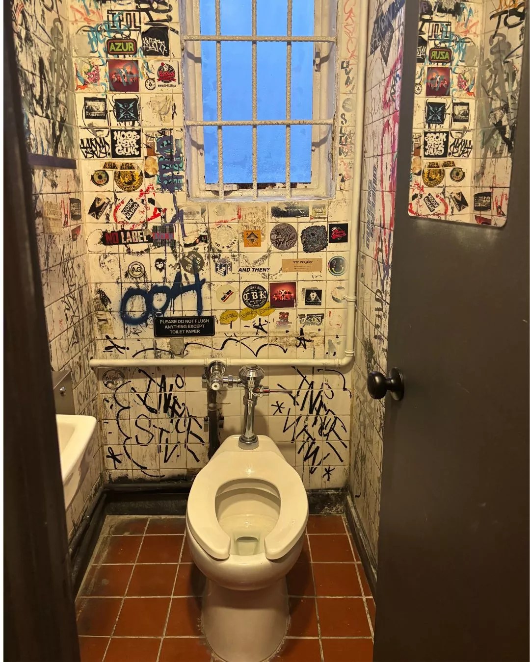 The doors opened at 8 p.m., but diehards started lining up at 4. Inside, it’s still Churchill’s, but with a fresh coat of paint. The stage has a new carpet. The infamous bathrooms in the corridor that connects the main room with the patio are mostly untouched (in faithful Churchill’s fashion). More bathrooms have been added up front near the pool table, and a third bathroom area has been placed across the main stage. Churchill’s infamous bathrooms. Photo by Flor Franceschetti Churchill’s renovated patio. Photo by Pati Laylle