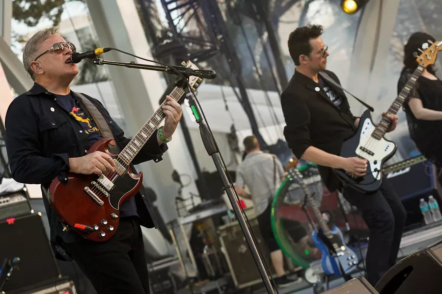 Over the years, Ultra has never been able to book Daft Punk to perform at the festival. (Daft Punk’s sole Miami festival appearance was at the short-lived Bang Music Festival in 2006.) It did, however, another French duo several times. Justice quickly reached mainstream audiences thanks to the success of 2007’s †and its follow-up, 2011’s Audio, Video, Disco. So when Justice headlined the Main Stage at Ultra 2012, they were one of the biggest acts in dance music. On the stage, Justice had all the hallmarks of that era: stacks of Marshall speakers and a glowing cross. The duo’s set quickly transformed the festival into a rave-meets-rock-show. Synthpop icons New Order performed at Ultra 2012. Photo by Ian Witlen