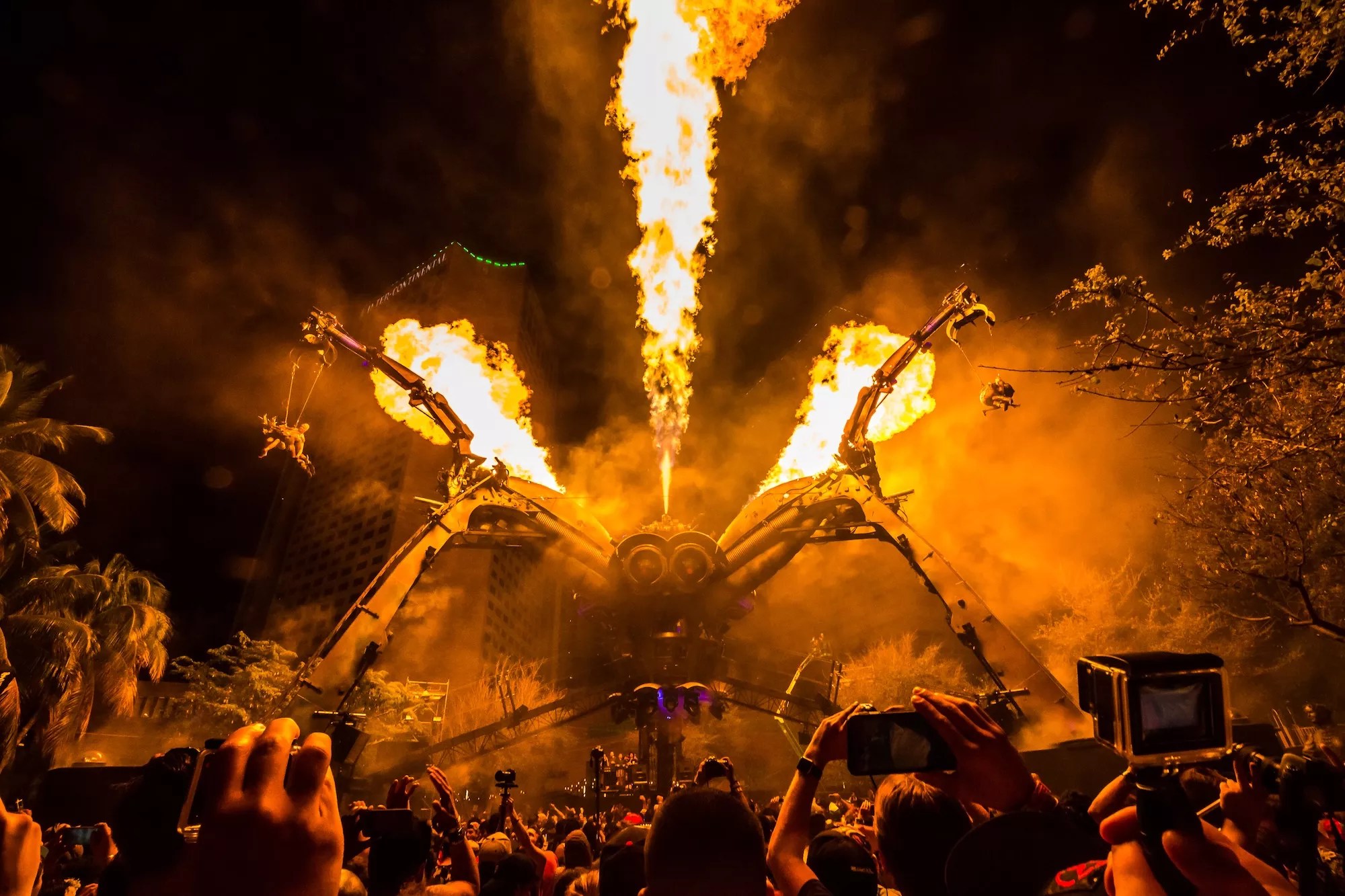 Pendulum members Rob Swire and Gareth McGrillen’s side project Knife Party had virtually eclipsed their original band by the mid-2010s. The Aussie duo capitalized on the drum-‘n’-bass-meets-dubstep sound called drumstep mixed with the electro house, which is perfect for festival stages. In 2016, the pair helped close the festival, bringing together their current Knife Party project before morphing into a Pendulum live set. Rage Against the Machine’s Tom Morello joined them to play guitar on tracks like “Battle Sirens,” “Bonfire,” and “Tarantula,” leaving everyone’s mind blown in the final hours of the festival. Resistance’s first stage was the Arcadia spider. Photo by Alive Coverage for Ultra Music Festival