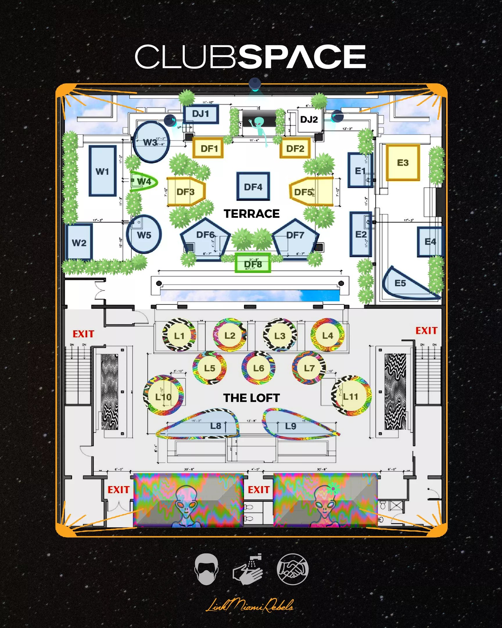 To enforce social distancing, there will be no dance floor. Instead, Space will feel more like a dayclub in which tables are set up throughout the terrace and loft spaces, with servers circulating.
