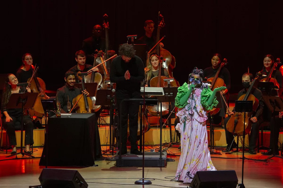 When she walked out on stage in a gorgeous pleated dress that resembled an elaborate kimono with her face adorned in metallic shielding, the hall erupted in applause as the singer went straight into “Stonemilker.” Behind her stood Icelandic conductor Viktor Orri Árnason and a 32-person string orchestra made up of local musicians.
