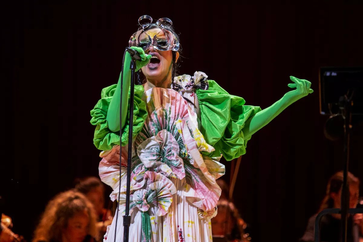 When she walked out on stage in a gorgeous pleated dress that resembled an elaborate kimono with her face adorned in metallic shielding, the hall erupted in applause as the singer went straight into “Stonemilker.” Behind her stood Icelandic conductor Viktor Orri Árnason and a 32-person string orchestra made up of local musicians.