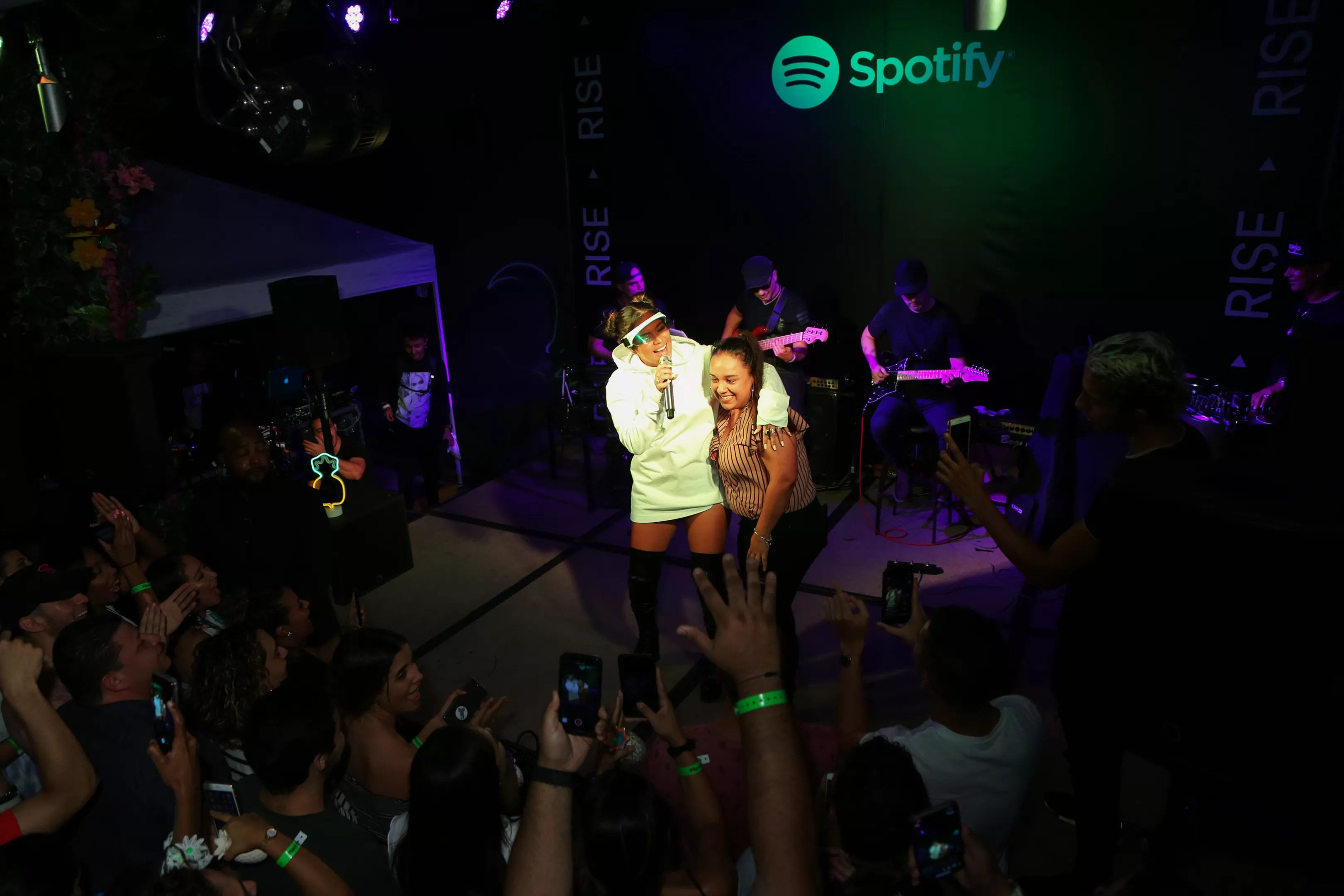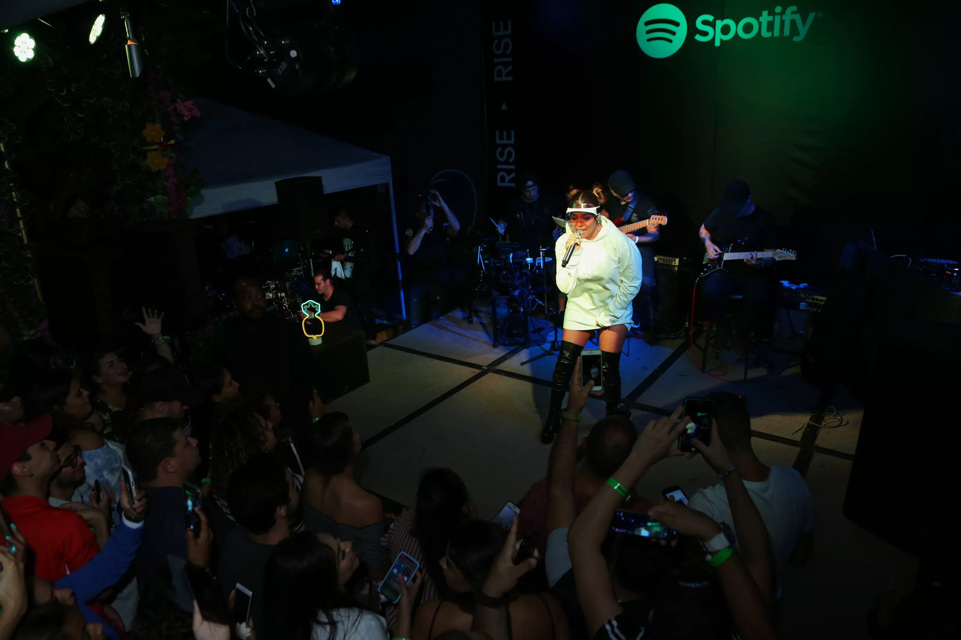 Spotify once again brought a rising music star to Miami last night after hosting a fan meet-and-greet with budding pop starlet Camila Cabello this past February. This time, Colombian singer Karol G made her way to the outdoor stage at Cafeina Wynwood Lounge for an intimate set in front of a couple hundred lucky fans who endured the humid evening.