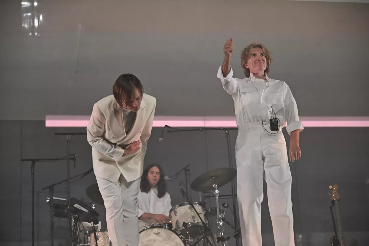 Dressed in all white, with each half of the duo on either side, flanked by stacks of keyboards and synths and a drummer in the middle, Air played surrounded by a square, white frame that was only a few feet taller than the band’s heads. Inside the box, a system of transparent screens and backlights played the visuals, mostly consisting of bold, matte colors filling the small space. Blood red washed over the band during “Talisman,” and geometric grids of pink light during “All I Need.” For the bright, nostalgic “Ce-matin lÁ ,” the band was bathed in warm, inviting oranges.