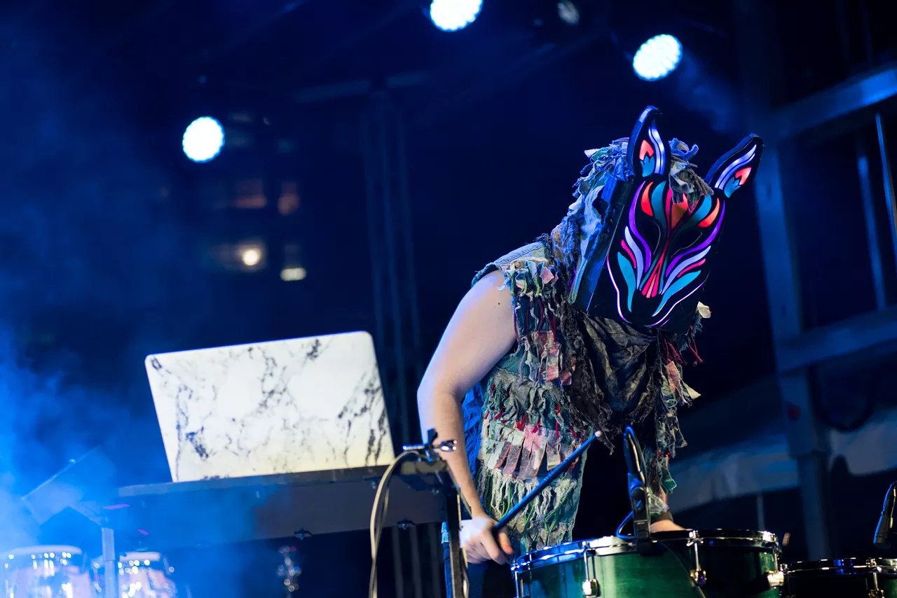 Slow Magic followed. Instead of sitting behind a multitude of controls, he seemed to play up the live-drumming aspect that is a signature at his shows. His neon mask illuminated the dark grounds as the stage lights pulsated behind him. Toward the end of his set, he jumped into the crowd, as he’s known to do.