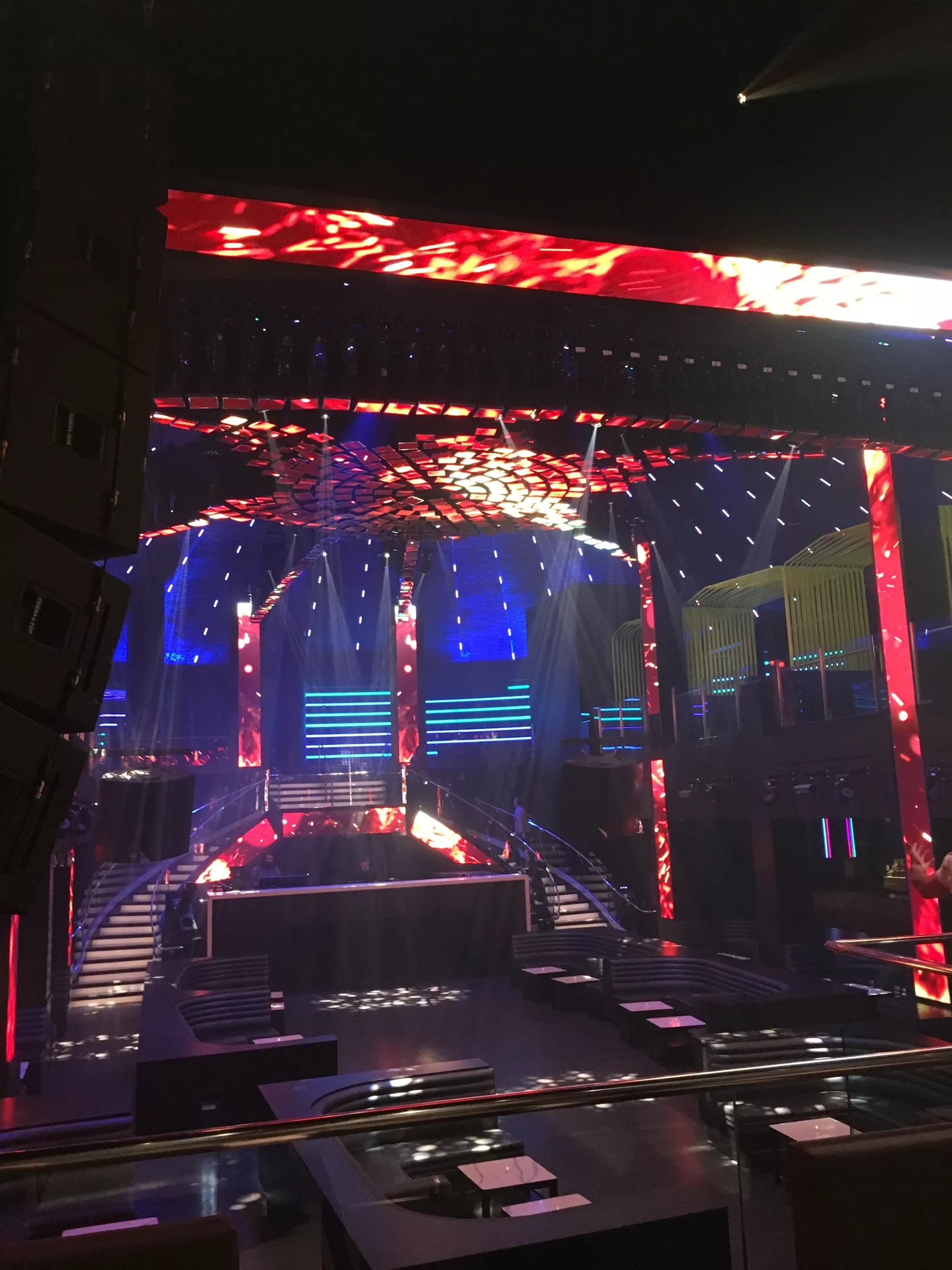 From the cascading double staircase that hugs the DJ booth and main stage, to the back wall that houses additional VIP seating and about 17 circular screens further manipulated by LED projectors, there is always something to see.