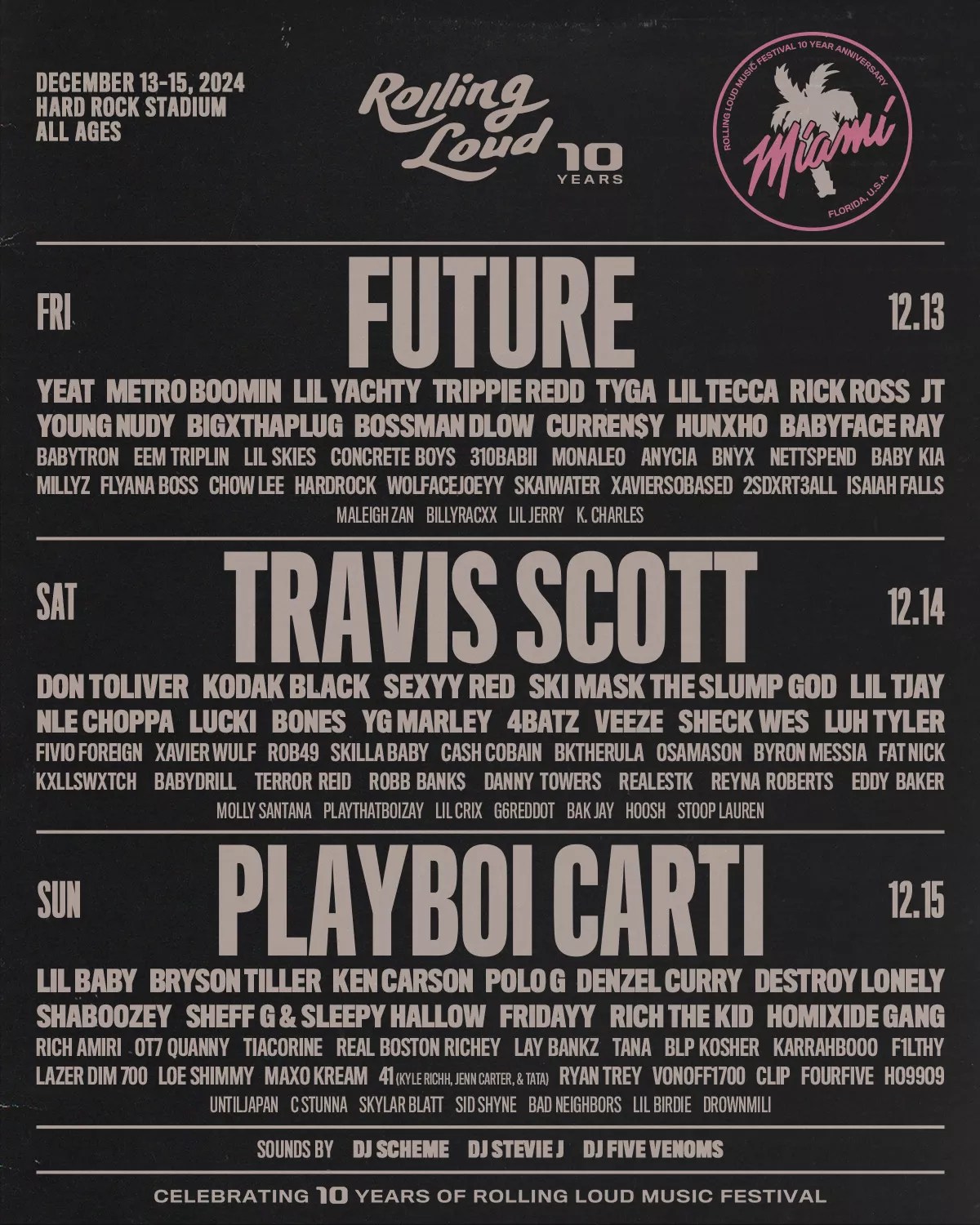 Homegrown hip-hop music festival Rolling Loud has announced the lineup for its 2024 edition, which also marks its tenth anniversary. Returning to Hard Rock Stadium December 13-15, this year’s headliners include Travis Scott, Playboi Carti, and Future.