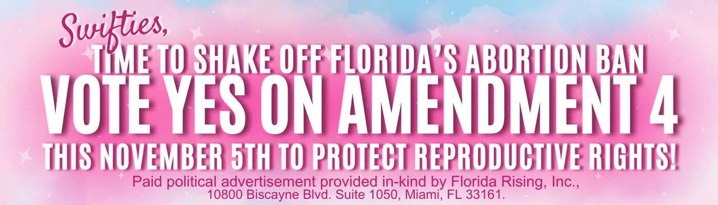 The cotton candy-colored billboard, which will go live today at 4 p.m., reads, “Swifties, time to shake off Florida’s abortion ban. Vote yes on Amendment 4 this November 5th to protect reproductive rights!”