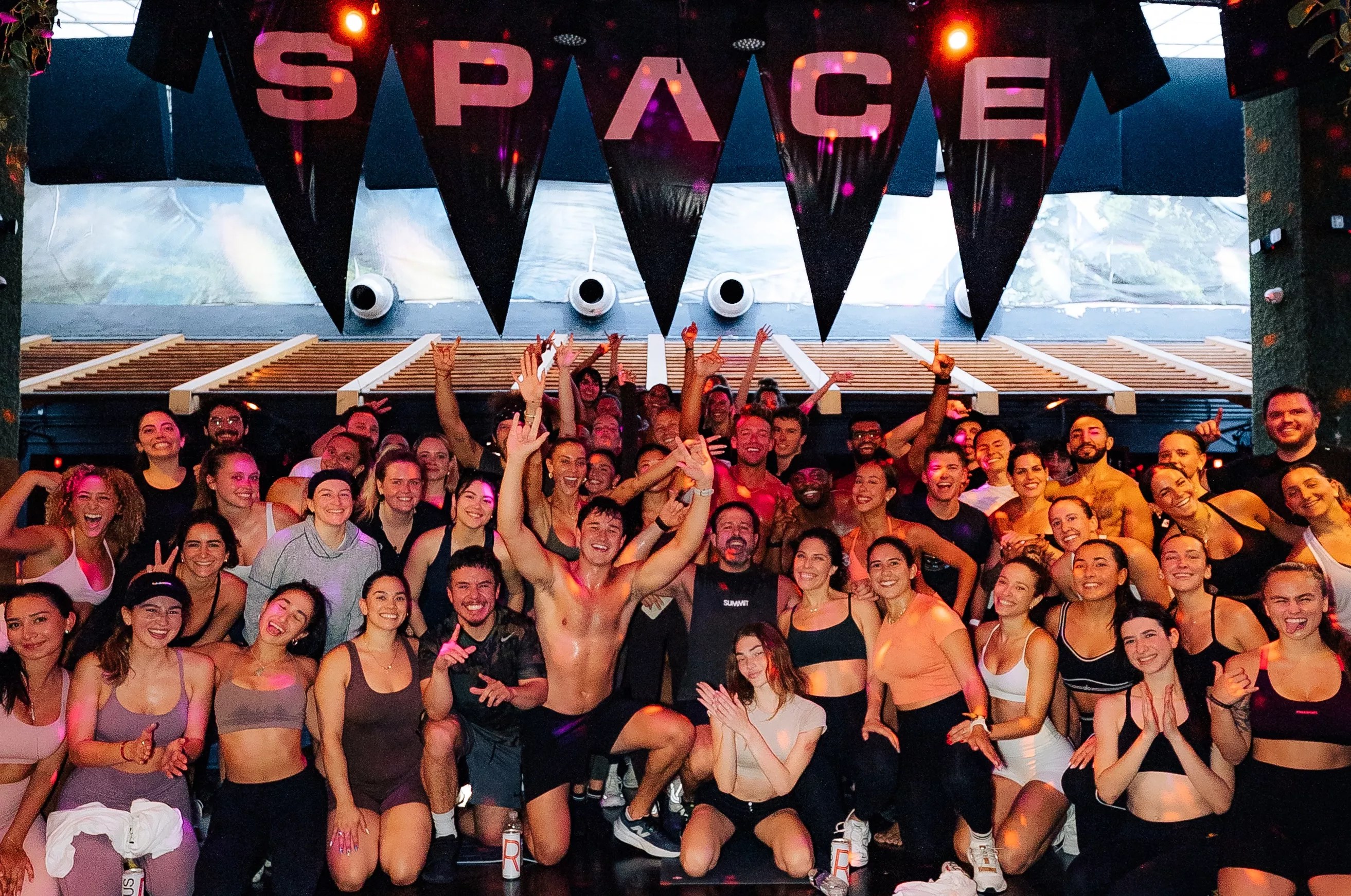 The light sprint was a warm-up for the 50-minute workout class, which was as intense and energetic as the tech house playlist booming over the speakers. Chavez led the session while Summit followed on his exercise mat in the middle of the dance floor. The calorie-scorching class included burpees, push-ups, planks, and squats. As the crowd panted through his hit song, “Shiver,” the DJ boosted the crowd’s morale: “Club Space, how the fuck we feeling baby?”