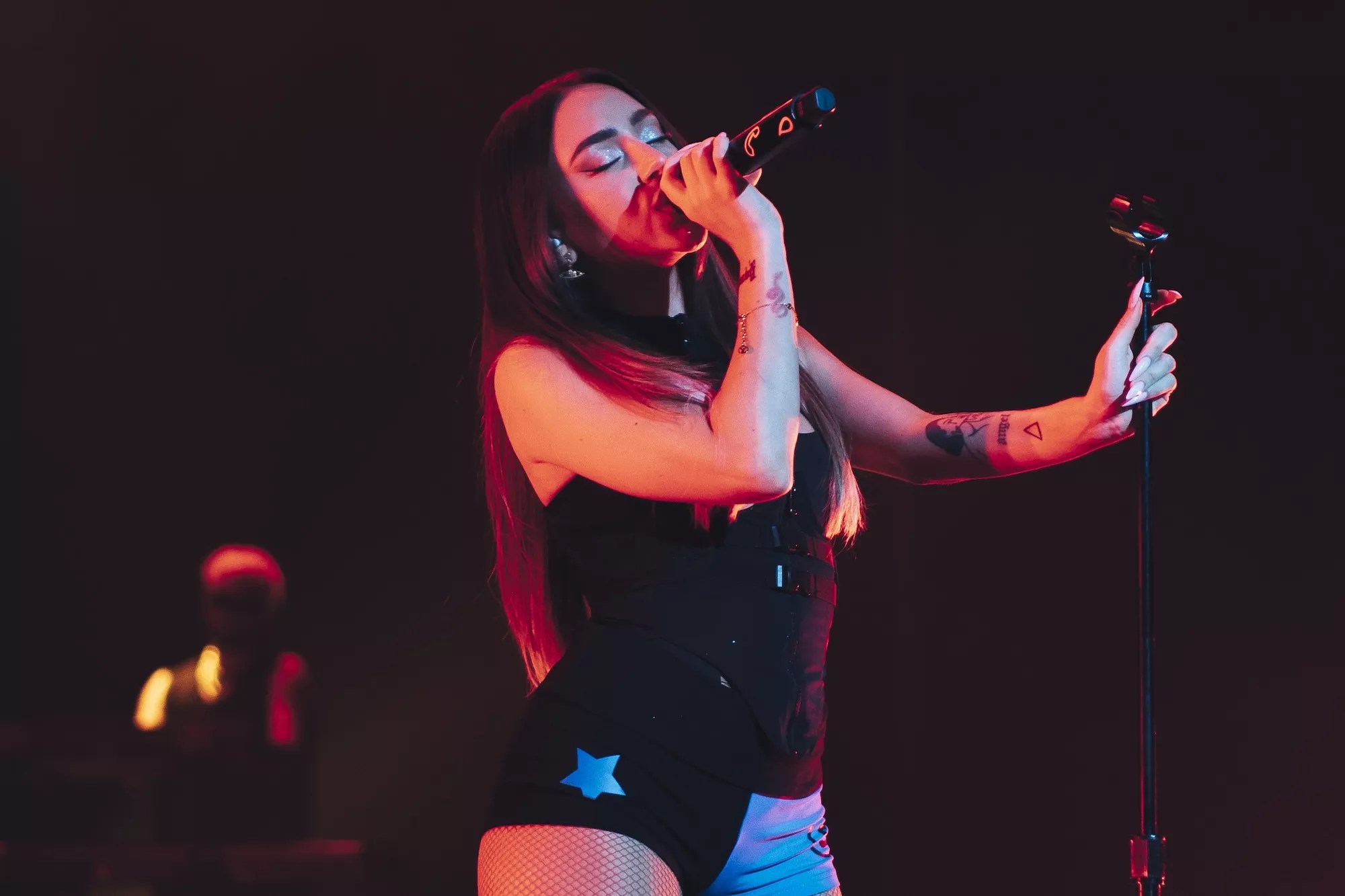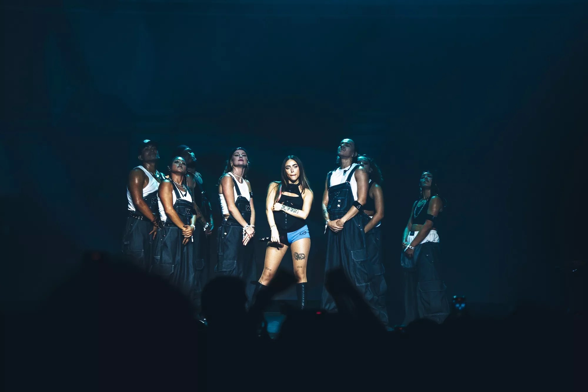Taking the stage at 8:40 p.m., Nicole beamed with the confidence of a seasoned professional. She’s clearly mastered her stage presence, giving off a cool and confident aura. Opening with “BZRP Music Sessions #13,” she performed in front of a live band and background dancers dressed in overalls with “NN” embroidered on them. She was dressed like a pop star, sporting long black boots, blue shorts, a black top, and spaced-out sunglasses, a far cry from the bandanas and oversized hoodies she wore back when she made her debut in 2019.