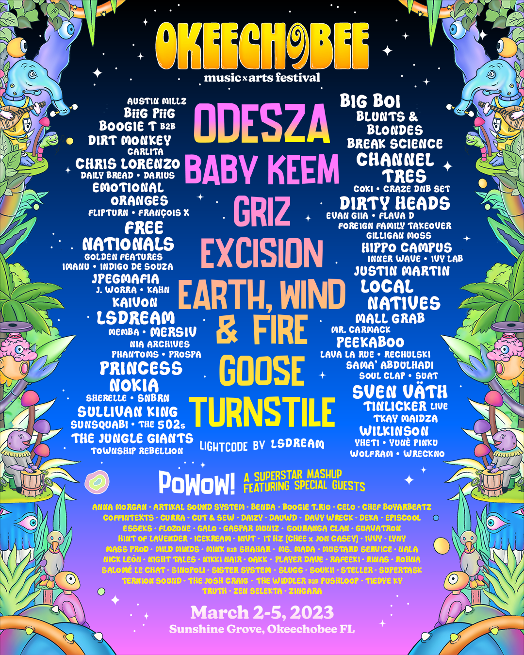Okeechobee Music & Arts Festival. Thursday, March 2, through Sunday, March 5, 2023, at Sunshine Grove, 12517 NE 91st Ave., Okeechobee; okeechobeefest.com.