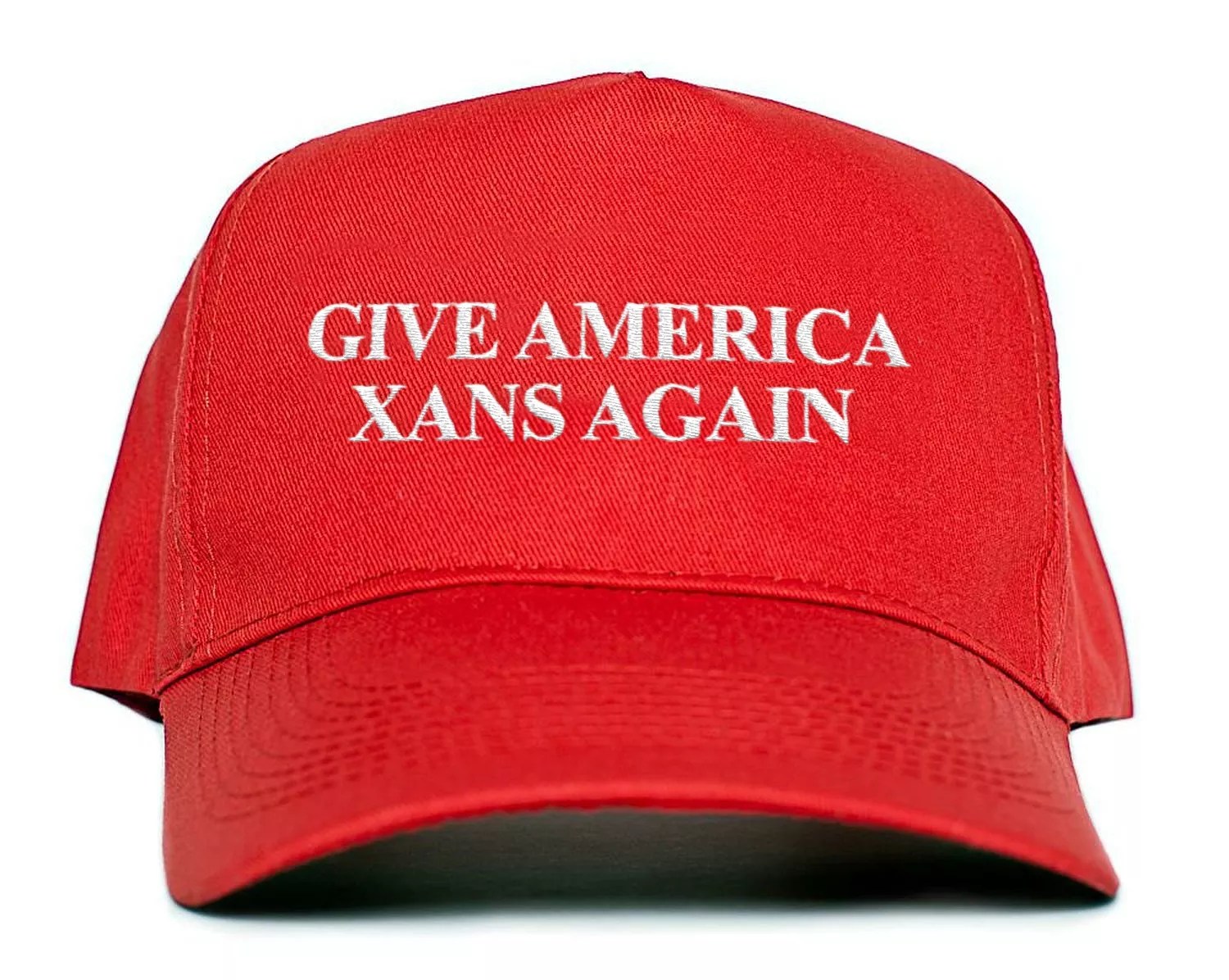 Proceeds from sales of their “Give America Xans Again” hat, modeled after Trump’s “Make America Great Again” trucker cap, will go to the ACLU, Planned Parenthood, NPR, and the National Alliance for Mental Illness. Vaynshtok says the Xanax shout-out is meant to be a comical nod to the mental duress many Americans have experienced in the first few months since the inauguration.
