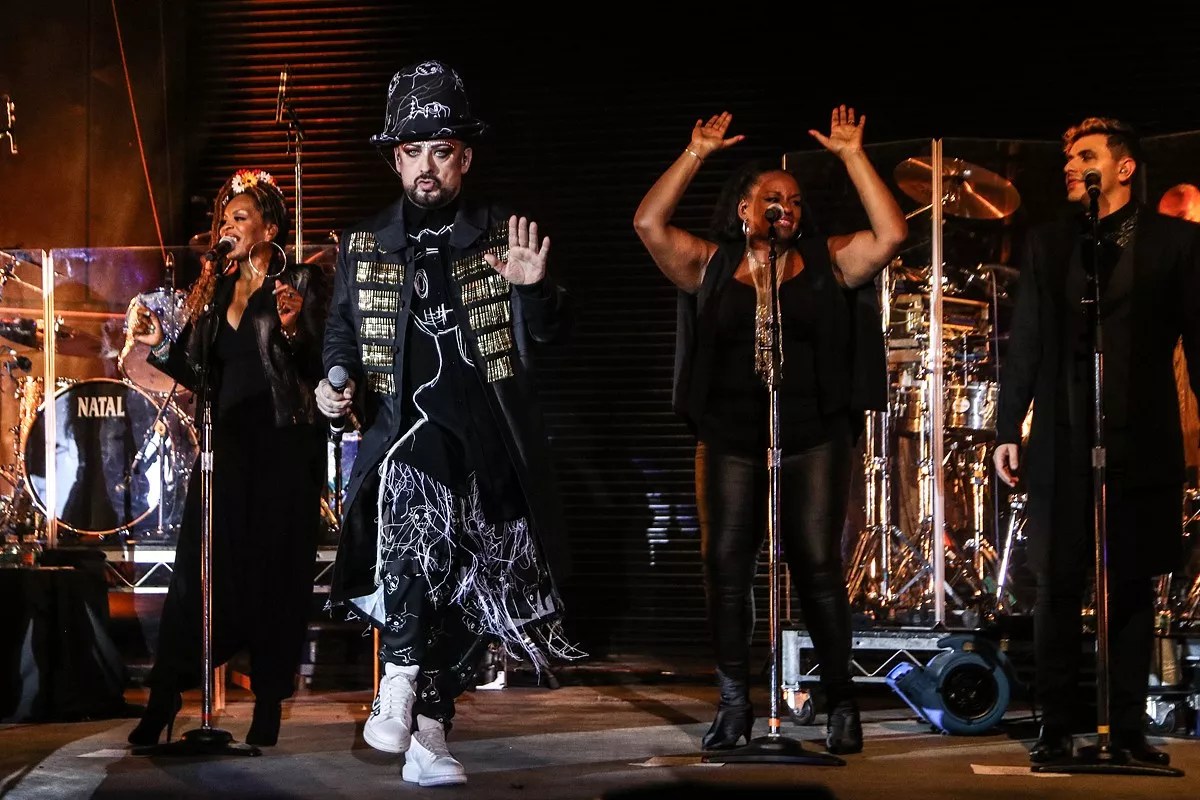 with lyrics in hand (he’d forgotten the words the previous night), George teased the audience, saying he had “a sneaky suspicion you might be waiting for something in particular.” Five hours into the night, they got what they were waiting for, with a harmonica-laden performance of “Karma Chameleon,” and George rushed off the stage just as quickly as his exhausted audience.
