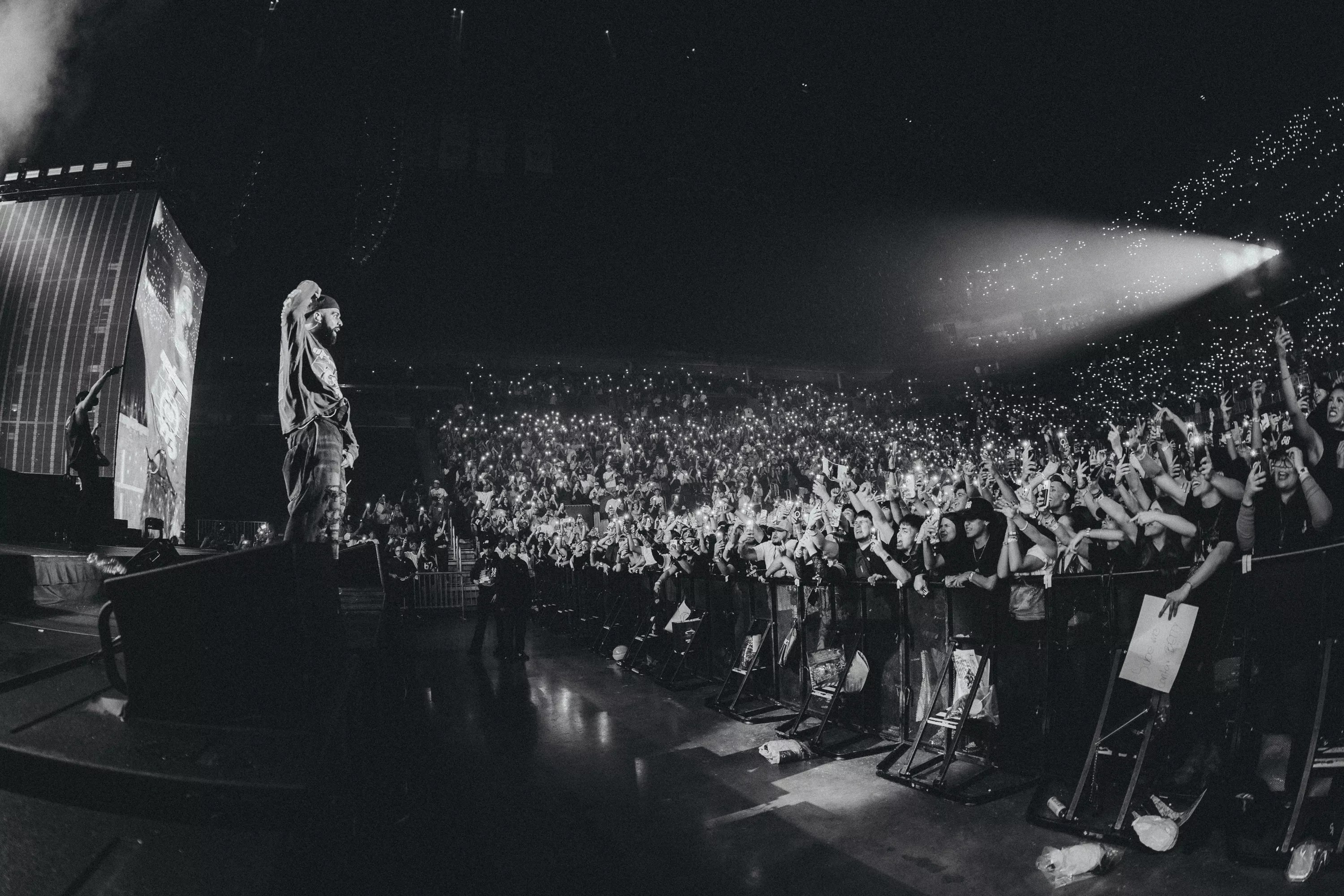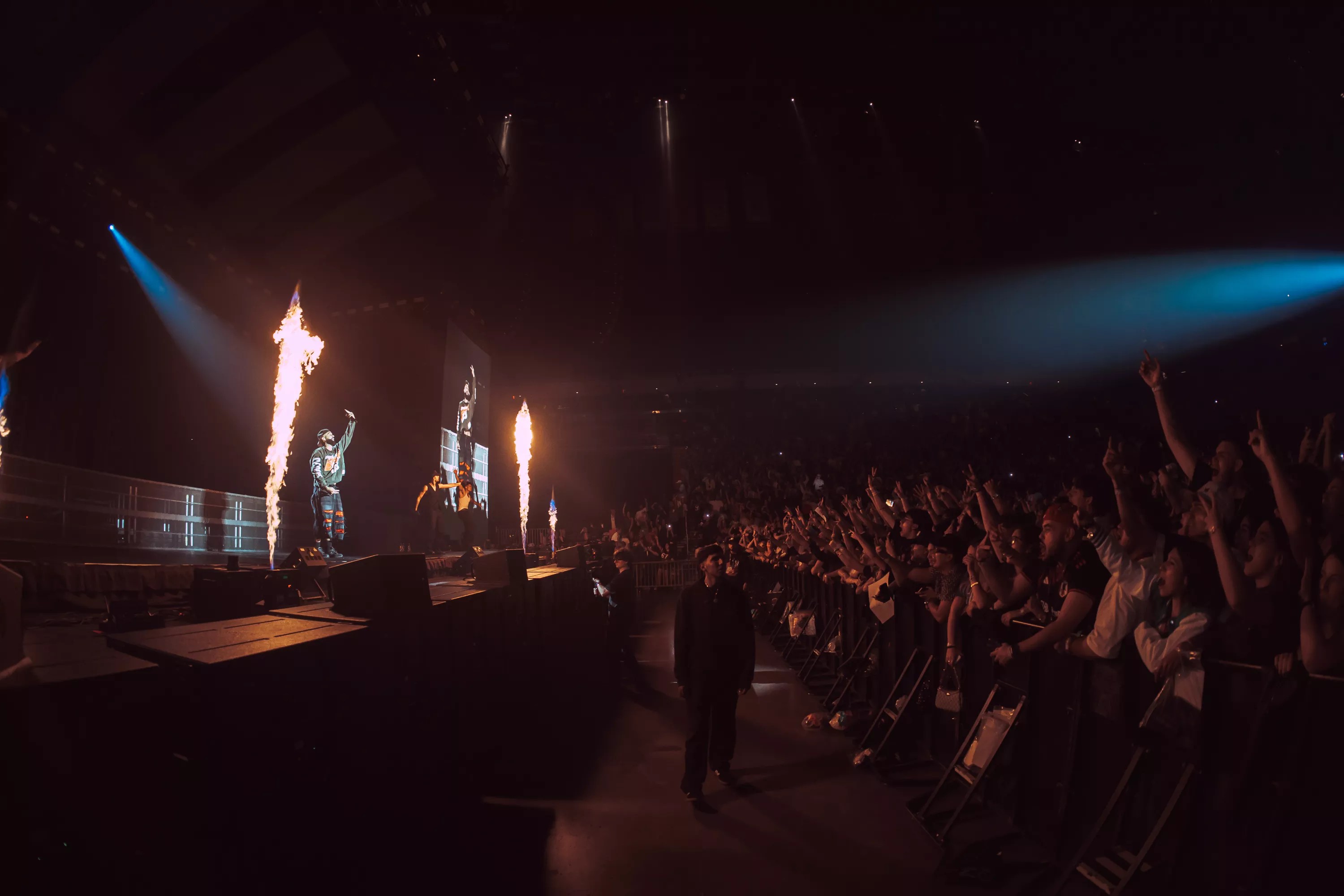 After a 15-minute break, the arena lights shut off completely, and the screens lit up with a Japanese Yakuza-inspired intro sequence. It felt like a scene ripped straight from Kill Bill – neon signs, sword-swinging aesthetics, and cinematic tension. When Eladio finally appeared, dressed in a sharp suit jacket that resembled a gangster boss uniform, the place erupted. He opened with “Invincible,” immediately rapping bar for bar with almost no backing track, proving his lyrical stamina and commitment to the live experience.