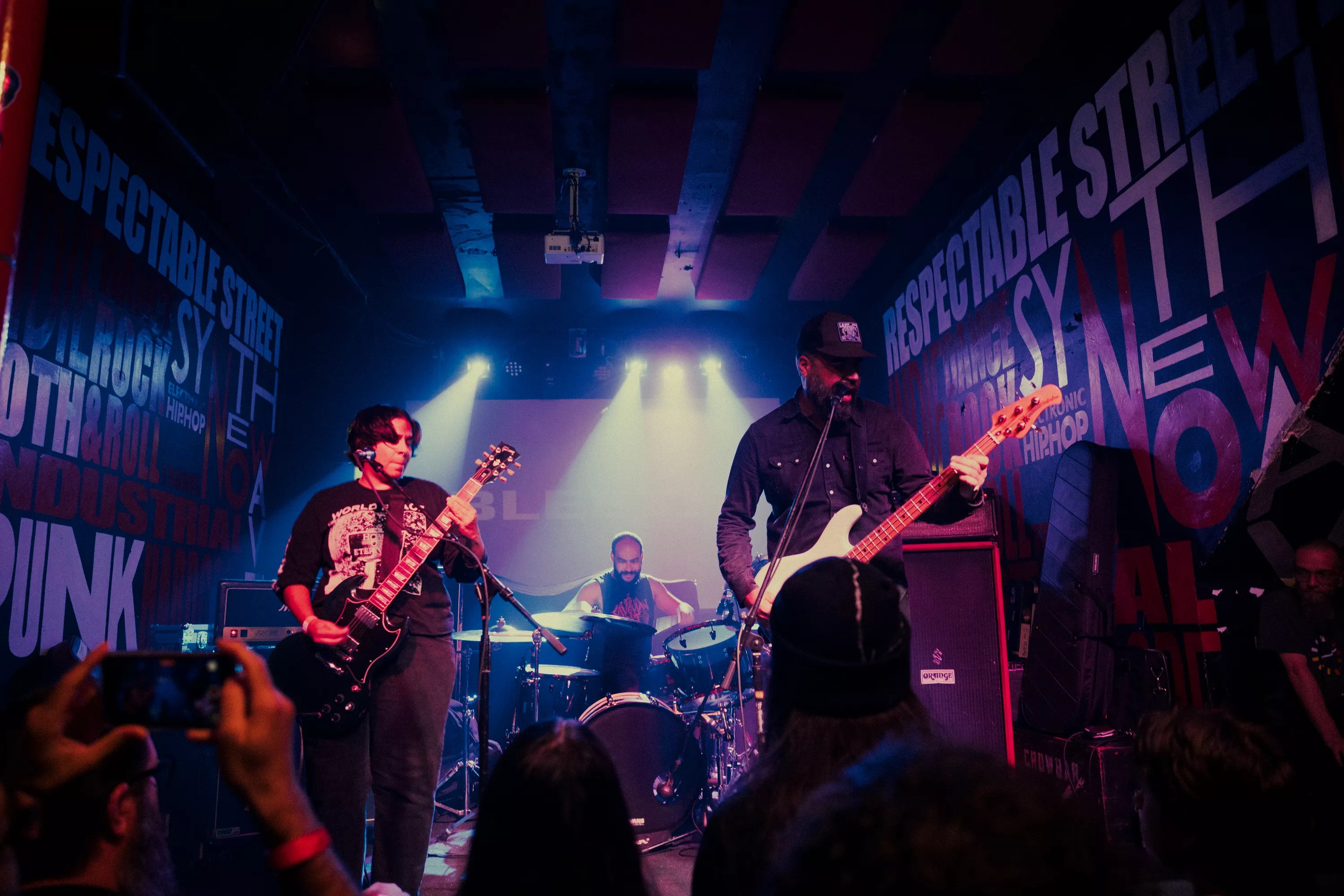 “We’re having fun,” Eyehategod vocalist Mike Williams said midway through the NOLA legend’s set. “We like having fun. We have a history of having fun.” Indeed, for a band whose best-known jams include songs with titles like “Sisterfucker (Part 1),” “Medicine Noose,” “Lack of Almost Everything,” and “Kill Your Boss,” Eyehategod does seem to be in a very happy, healthy place. (The impromptu jam of a few bars of Black Flag’s “Gimme Gimme Gimme” was a fun touch.) And the band is sounding freaking phenomenal these days. Guitarist Jimmy Bower is a national heavy metal treasure churning out grooving homages to/perversions of the Black Sabbath gospel, book of Vol. 4 with the verve and precision of a seasoned artisan – something that felt a little poignant coming so close to the final Sabbath/Ozzy show a few weeks ago. This is less surprising than Williams maintaining his voice and attack, which is somewhat unusual in his extreme metal field, generally speaking, never mind for a guy who has lived as hard and been through as much as he has. (Remember, this is a man who stared death down, waiting for a liver transplant less than a decade ago.) The dialed-in set had a victory lap vibe, yet the serrated edge was never lost. Eyehategod played a sold-out show at Respectable Street. Photo by Maysa Askar / Courtesy of Heroes Live Entertainment