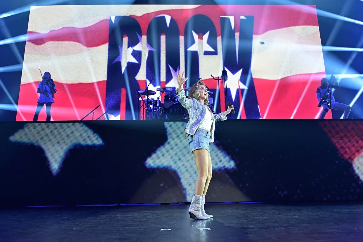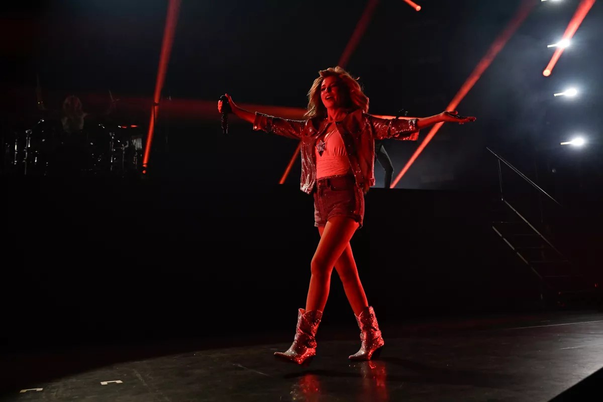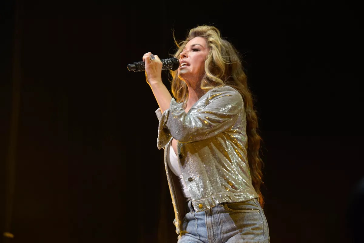 Taking the stage at exactly 8:34 p.m., Twain appeared in silver sequined boots, yes – New Times was able to get that close! – jean shorts, and a matching sparkle-drenched jacket. The outfit shimmered under the lights as she launched into “Rock This Country!” backed by her band dressed in crisp white. The visual balance gave Twain the center stage she commands and deserves.