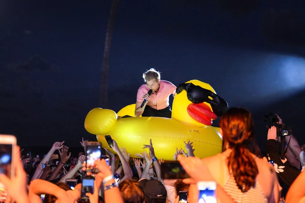 Thankfully, the music onstage was mostly fun. Saturday saw Joywave, New Politics, and Saint Motel, three youngish indie bands all rock fans should know. Andrew McMahon in the Wilderness, a late-afternoon standout, rode in on a giant rubber ducky and thrilled the crowd with his optimism and enthusiastic energy, at one point proclaiming, “Tonight I celebrate the good. We celebrate each other.”