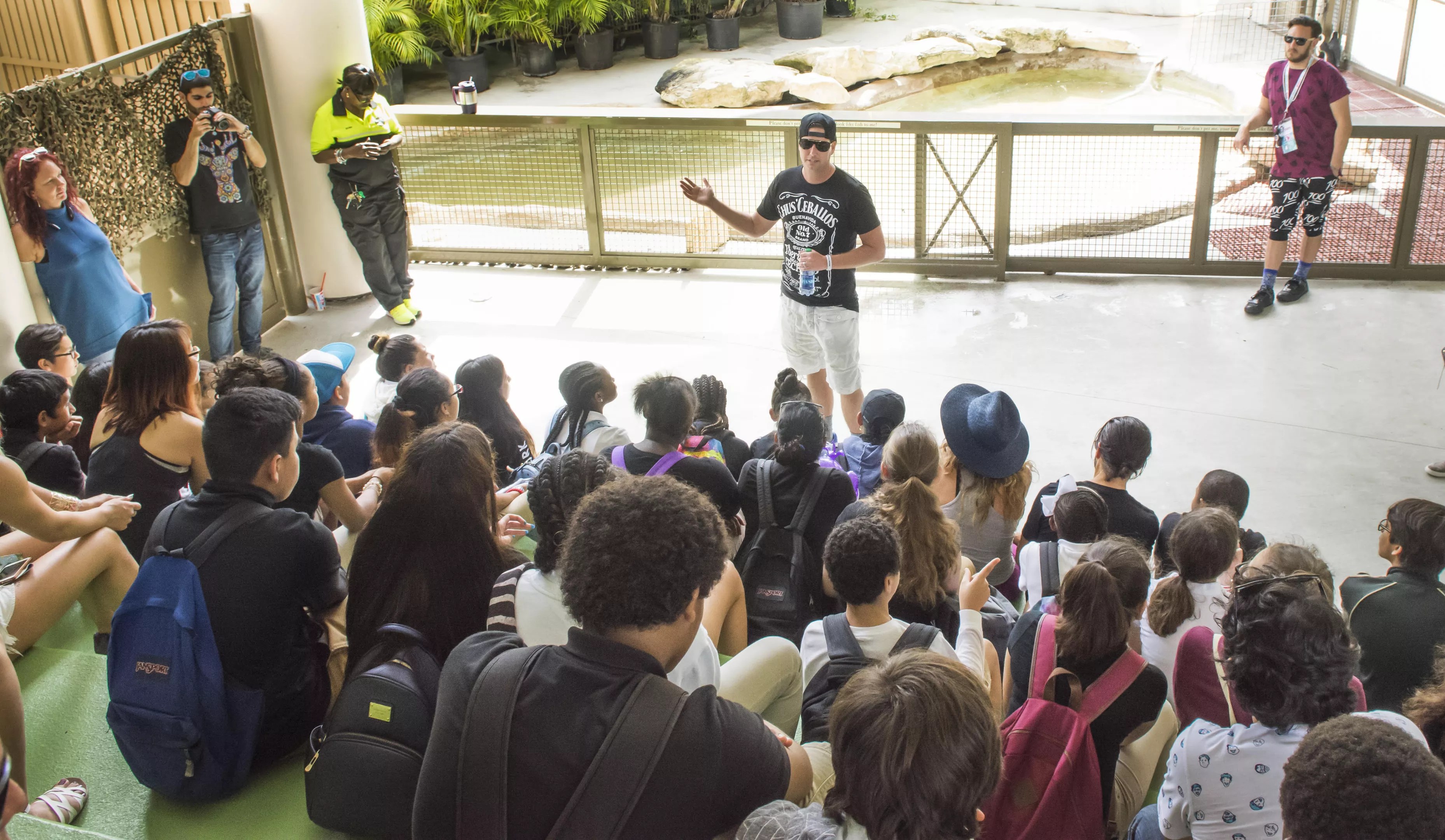 At Jungle Island, Groove Cruise founder Jason Beukema speaks to seventh-graders from Fienberg-Fisher K-8 School.