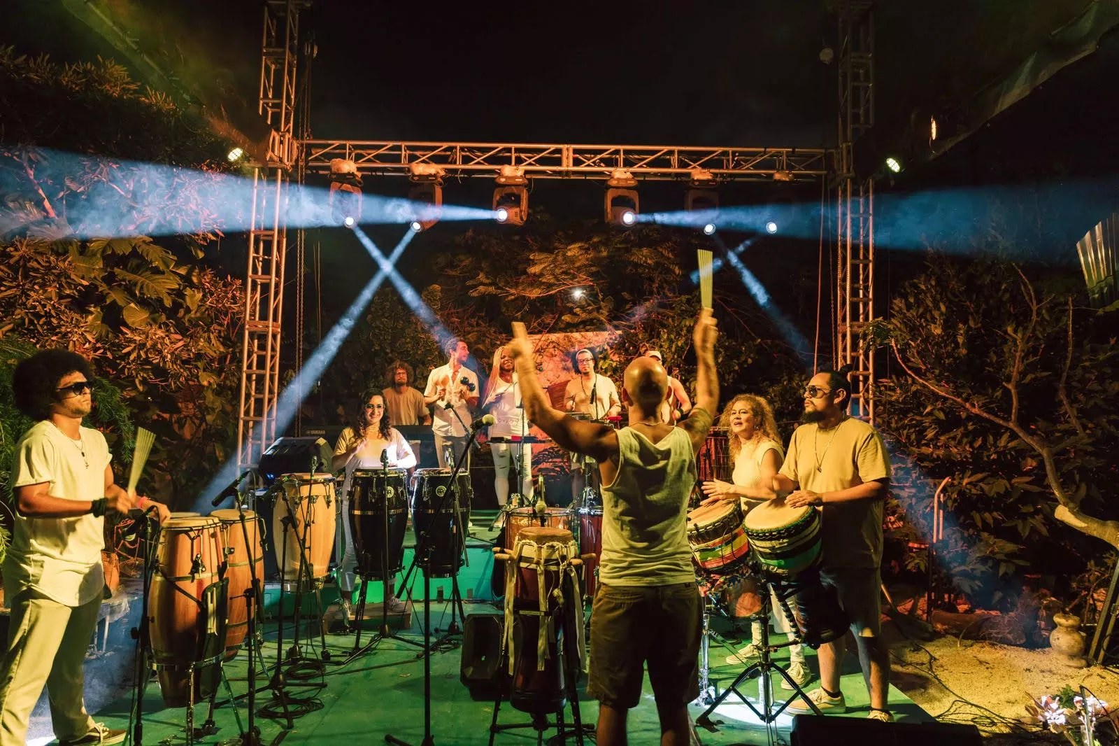 As the band rehearses, the sounds of unscripted drum beats and piano keys carry on the breeze. The tree branches overhead sway and let fall tiny mango flowers.